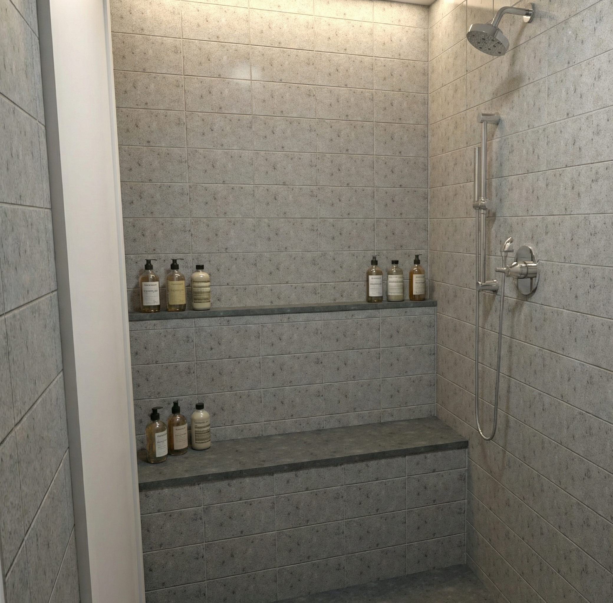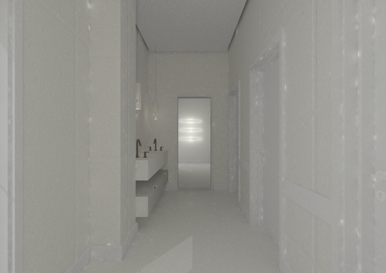 photorealistic render of a narrow bathroom corridor in an industrial minimalist style do not modify the architecture spatial layout proportions or volume in any way preserve all existing walls openings ceiling height and circulation materials and finishes walls exposed concrete texture on most surfaces right wall gray brick masonry with subtle industrial texture floor polished light concrete or stone vanity matte dark gray with natural wood accent metal elements faucets fixtures handles and accessories in brushed yellow metallic brass finish subtle and elegant mirrors and lighting back opening fully reflective mirror surface no transparency ceiling and lighting perimetral led strip lighting integrated into the ceiling create a continuous light gap between ceiling and walls soft indirect lighting warm neutral temperature 3000k 3500k atmosphere industrial minimalist calm and refined balanced contrast between concrete brick and brass