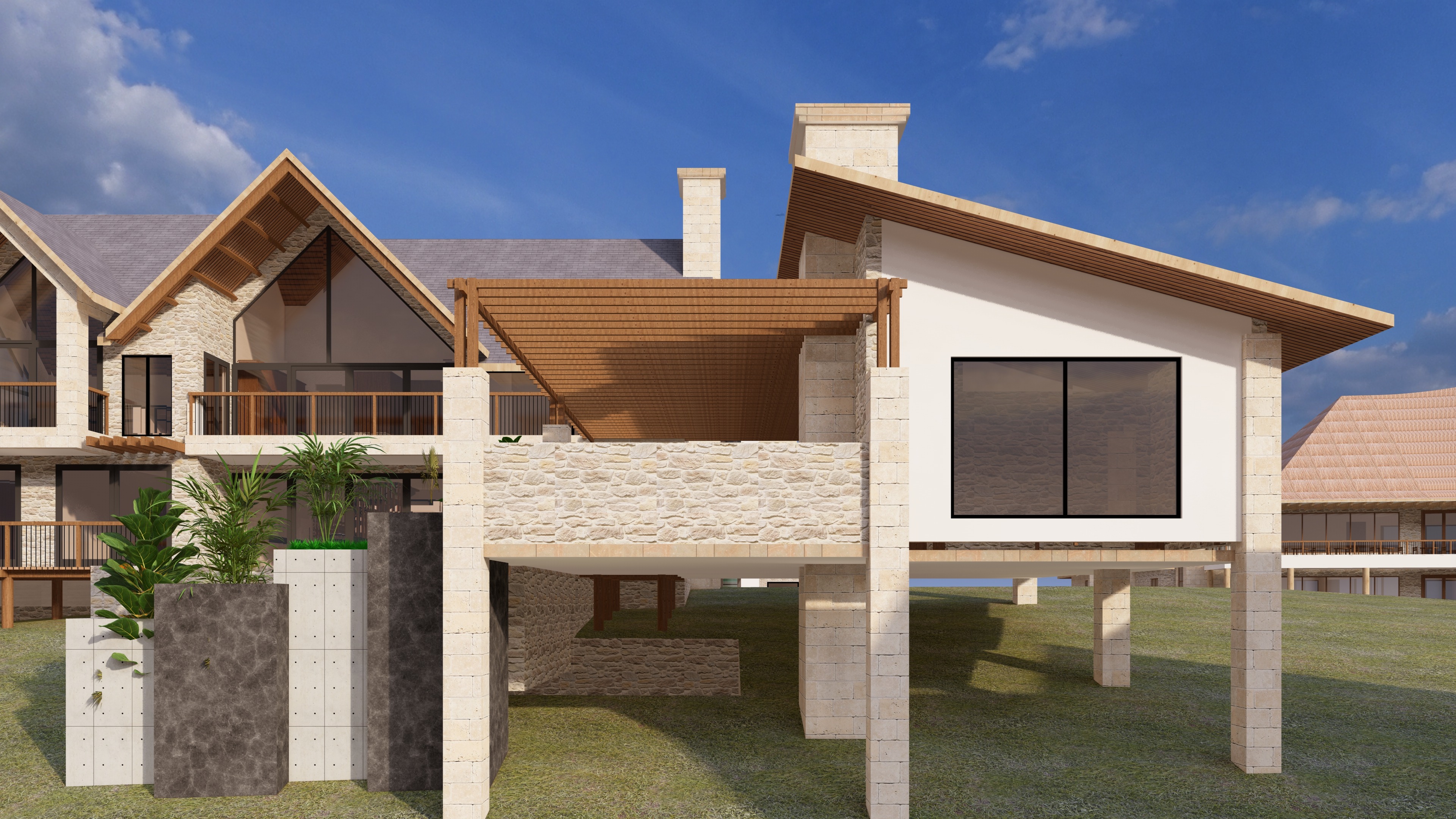 a model of a gazebo add few trees in background and far background for context put a little neat vegetation for context make it look lived in add dim interior warm lighting