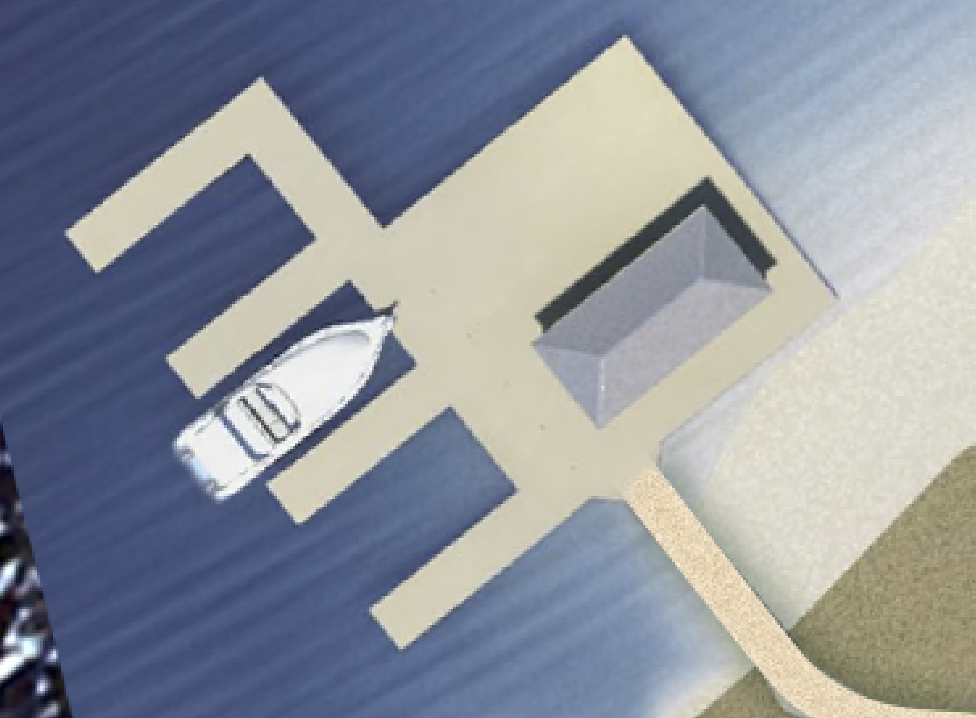 turn this top view plan of a dock on the water into a rendering golden hour lighting keep the size as is blue water keep the aerial dead on top view