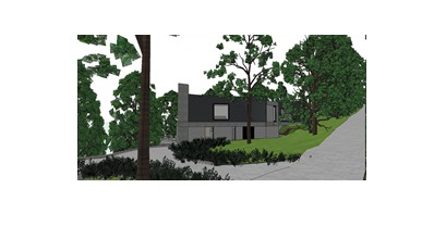 generate a visual of this house my architect has designed the windows are black aluminium the black grey areas of wall are black vertical timber cladding the grey walls are grey bricks with a concrete band around the buildings between storeys ther is also a gabian wall at the lower level in areas add some wild planting domestic in style by stylish and classy and add landscaping and trees in the backhround and foregroud thre are no houses or other built forms nearby just trees provide trees to outside of site and show grey briick and provide mjore wild planting to rer garden do not chnage angles or the house design provide planting and bushes on the boundary with the grey road