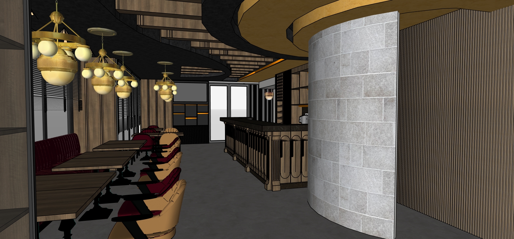 photorealistic interior render of a modern lounge bar or cafe elegant contemporary design dark ceiling with exposed wooden beams hidden led strip lighting integrated between the beams soft indirect ambient lighting glowing from the ceiling warm and cozy atmosphere stylish seating with modern furniture wooden and marble textures bar counter with subtle lighting realistic shadows and reflections cinematic lighting ultra detailed textures architectural visualization depth of field 8k resolution photorealistic professional interior photography high end interior design