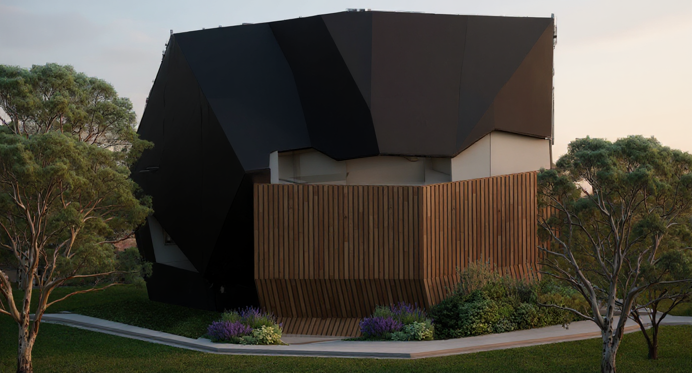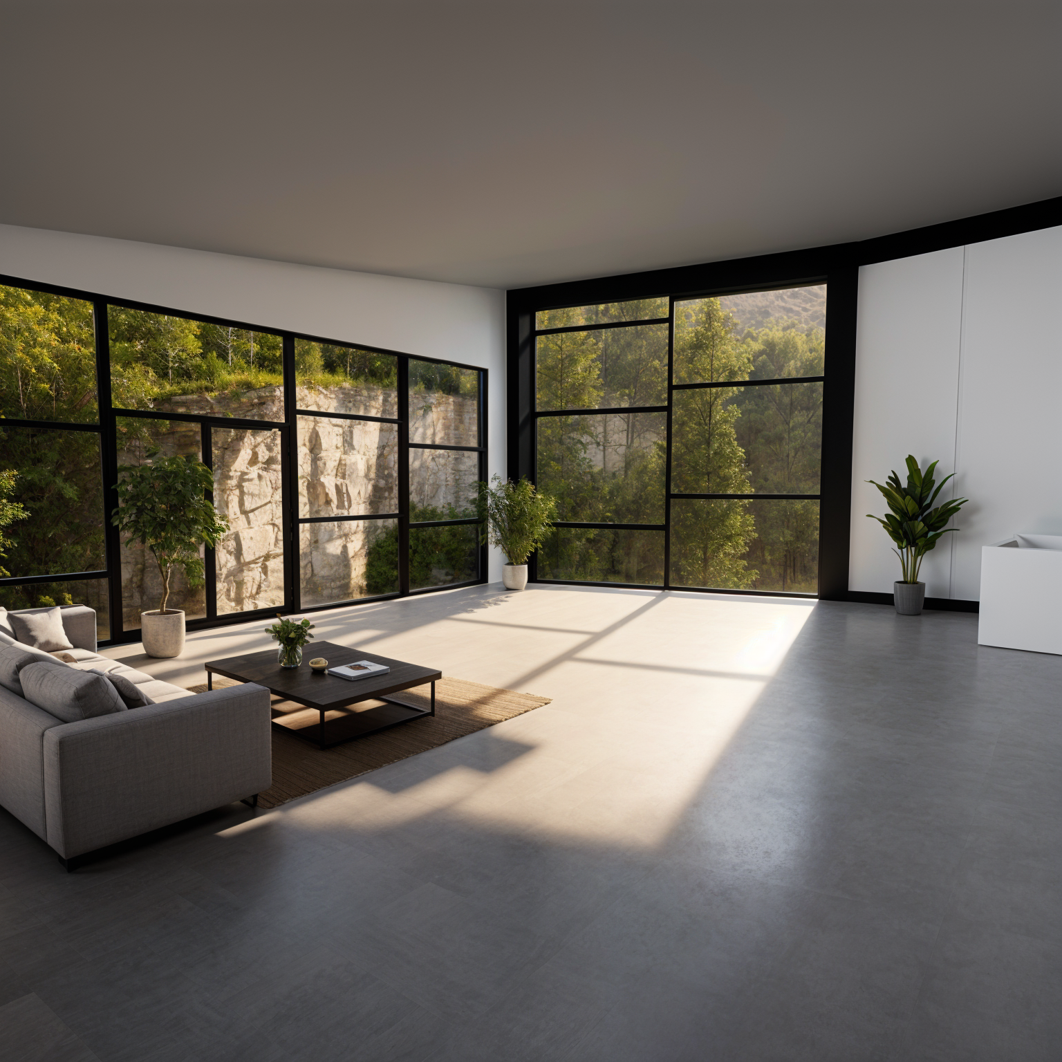make a furnished day room with a cliff forest view out the windows black trim walls mid century modern cabin style walls and floor so beige and woof