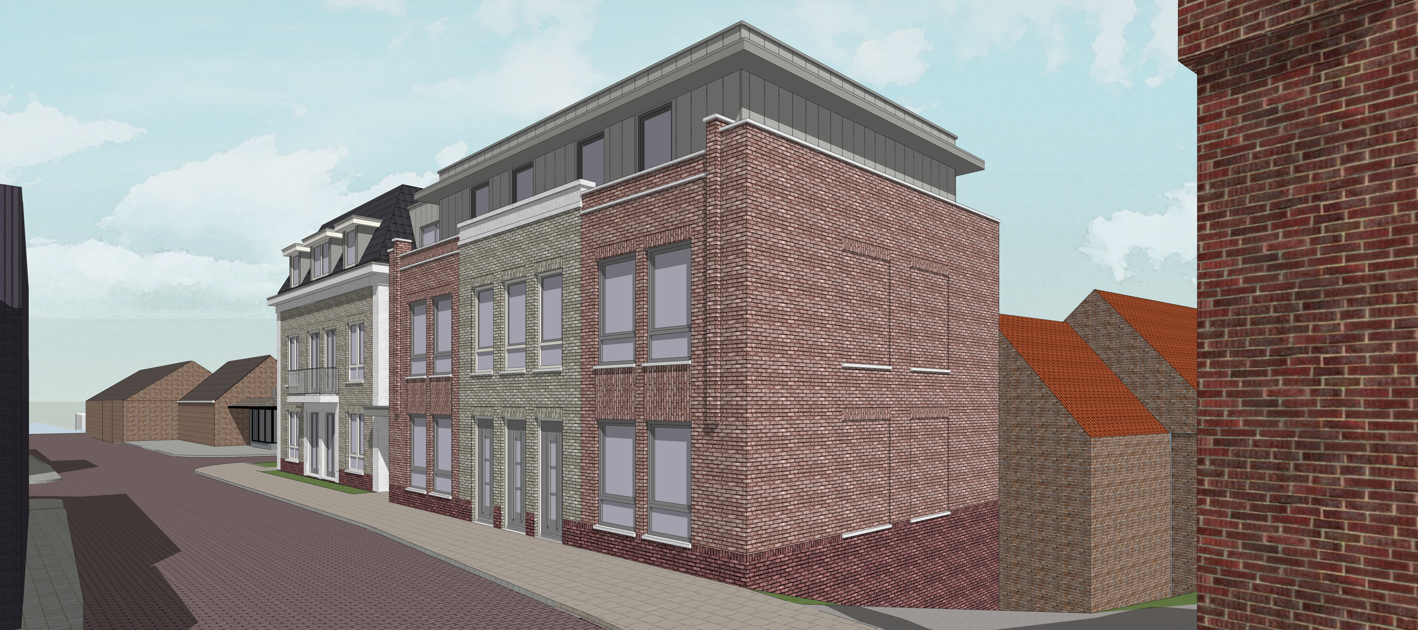 add some trees point sun on facade place curtains behind the windows add some realistic people on the sidewalk no windows in side facade keep bricks more realistic