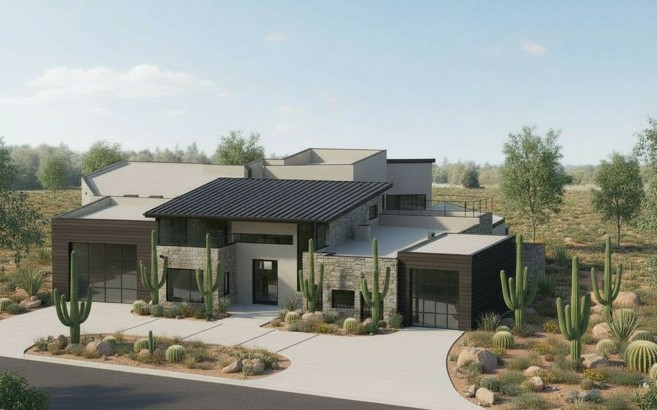 replace the background with mountains you would find in scottsdale az keep the landscaping and the building in tact