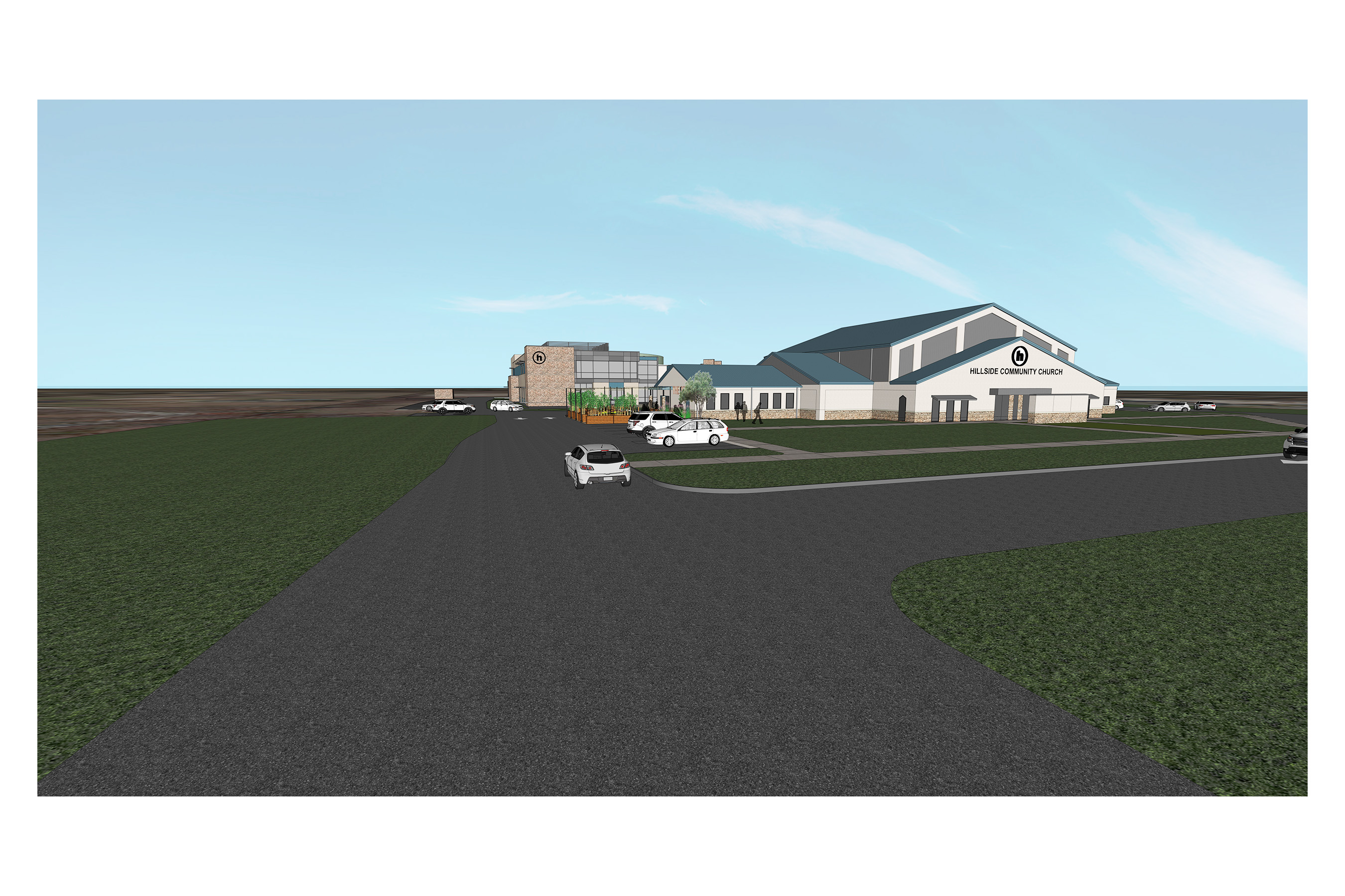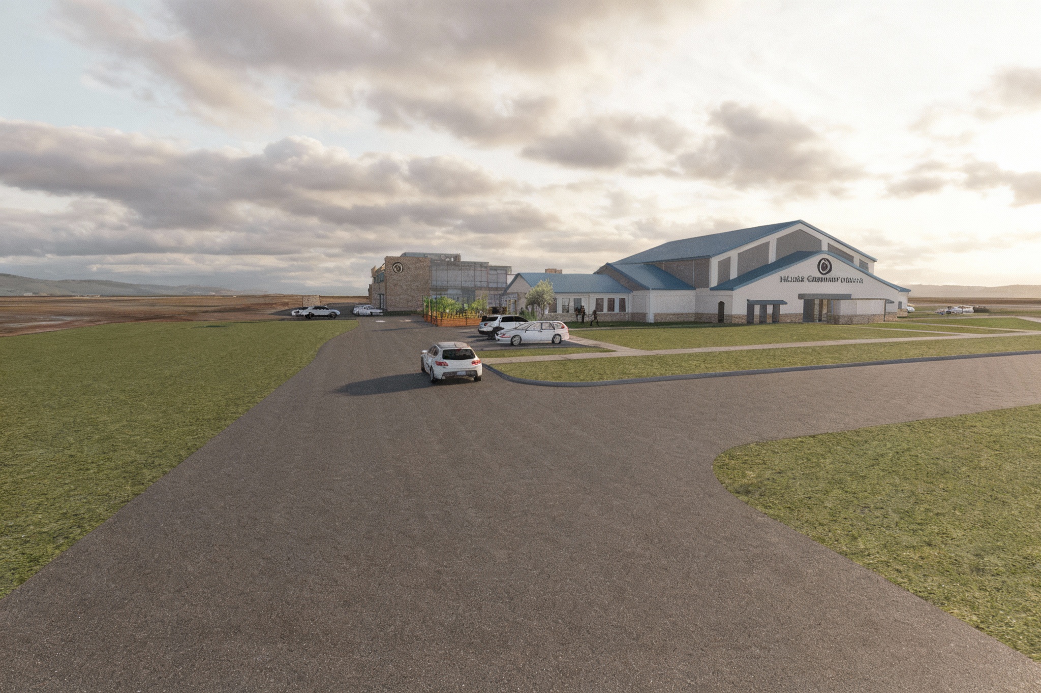 photorealistic rendering slightly grainy add cloudy sky sign on the front of the building should read hillside community church