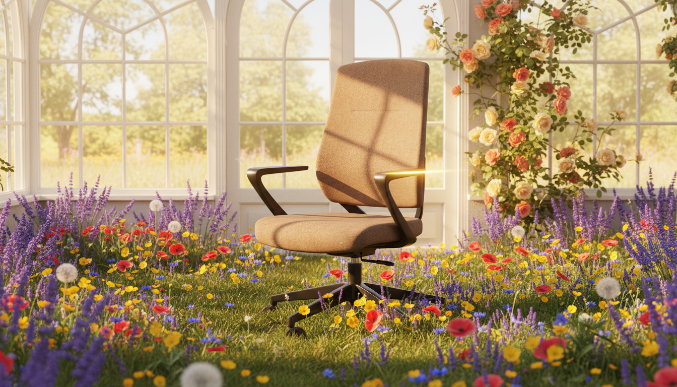 bold joyful spring campaign cover camel tweed texture mid back office chair matte black frame and base scene graphic spring color studio set background large overlapping soft color circles and arcs mint green soft coral pale lemon yellow powder lavender like oversized macaroon color swatches layered behind chair floor smooth blush pink surface with gentle reflection of chair scattered spring props pastel colored eggs small terracotta pots with blooming hyacinths purple and pink a single yellow tulip leaning against chair leg chair contrast warm camel fabric as sophisticated neutral anchor amid pastel color explosion black geometric armrest adding graphic structure fine fabric grain catching soft diffused studio light lighting bright even spring studio light soft shadow beneath chair on blush floor gentle color reflection from background onto chair surfaces clean and fresh no harsh shadows color palette mint coral lemon lavender blush pink warm camel chair spring macaron palette style copenhagen design brand spring launch joyful maximalist pastels 8k top area clean white for headline text overlay ar 2 3 style raw stylize 300 q 2