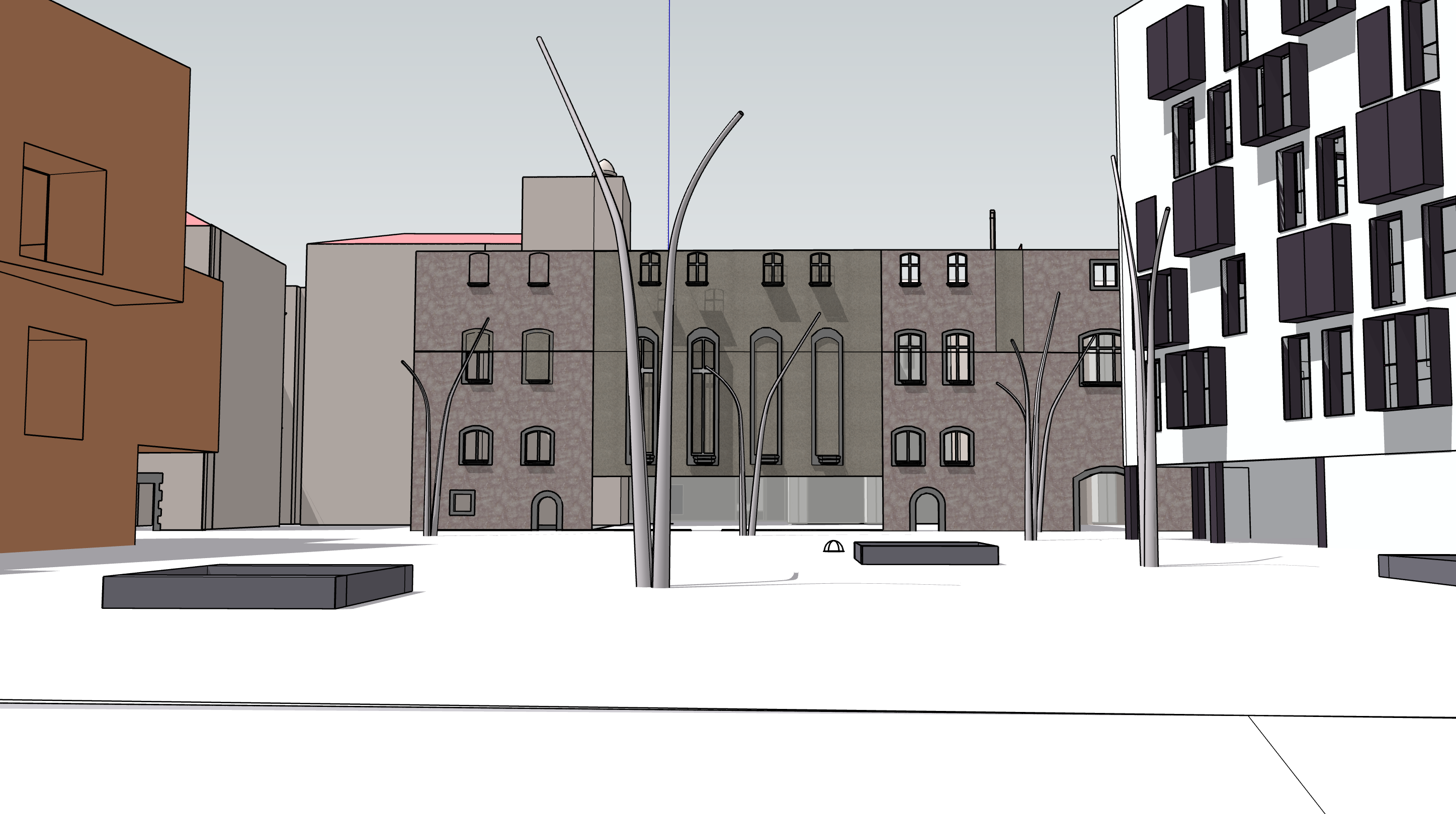 vista frontal con suelo continuo de panot a adir algun arbol y persona lass oberuras todas con vidrio