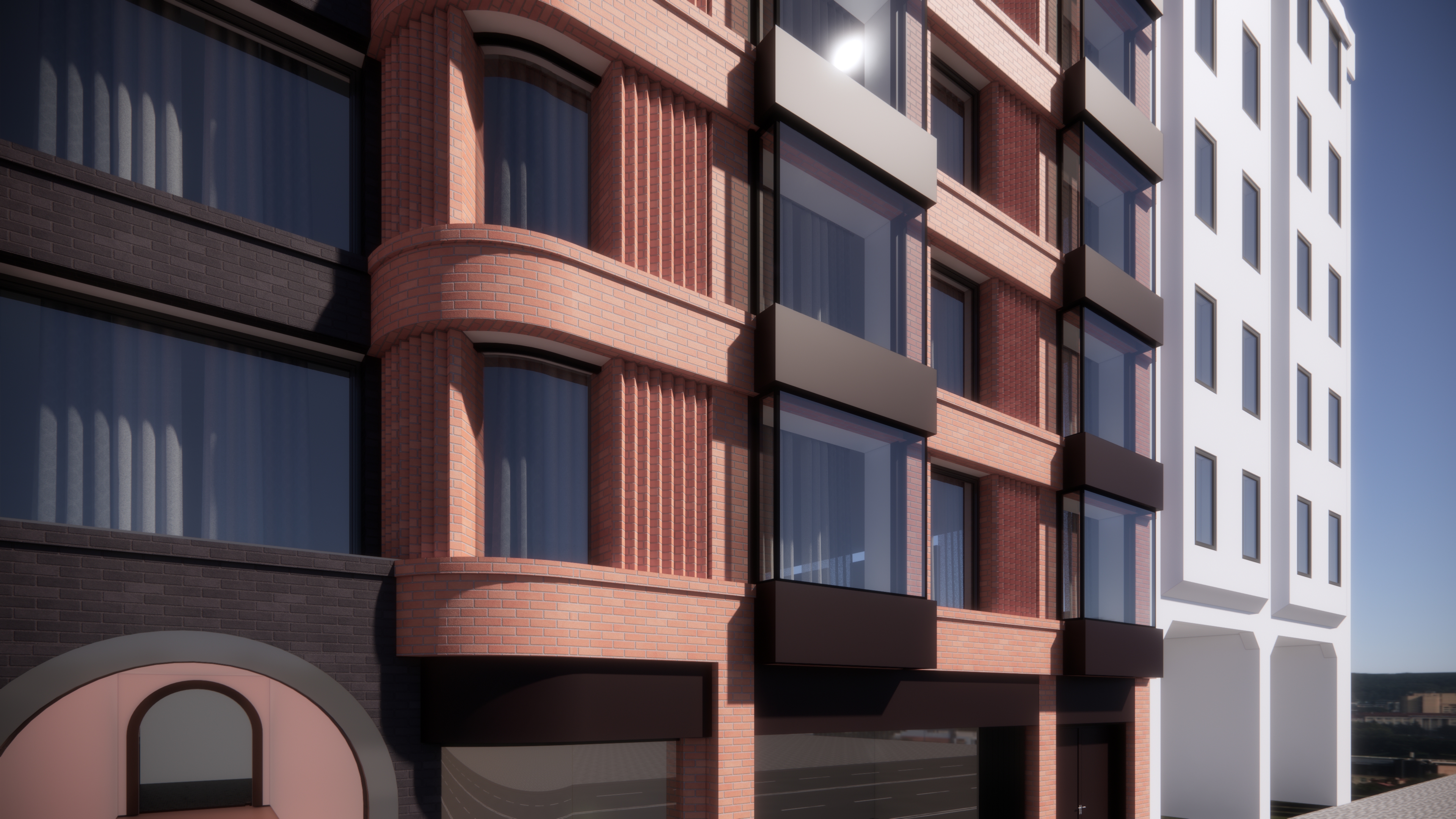 please enhance this image boosted window contrast and reflection street details with pedestrians and subtle improve brick material details upscale the image to hd do not change the geometry