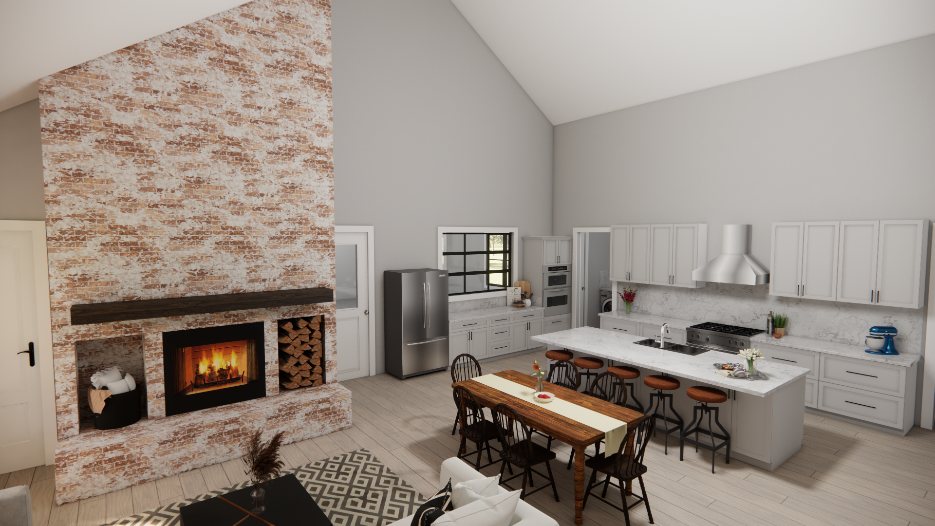 you are a professional image renderer you create the highest grade renderings around and specialize in architectural renderings this is an interior rendering of a great room in a barndominium create a high resolution photorealistic image of this room keep the windows as they are where they are keep the doors as they are where they are keep the main structure as it is where it is feel free to change the perspective keep the roofline as it is where is it do not add anything to the structure that i have not asked for