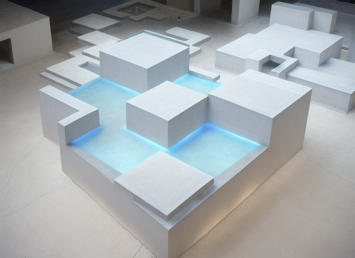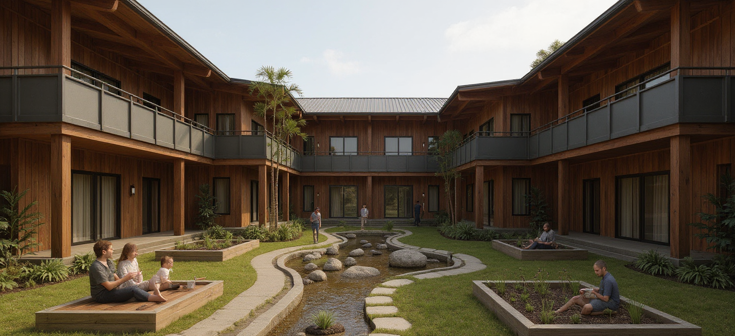 a contemporary upper plaza located at el pueblo de los ngeles the plaza sits between classrooms and workshop spaces forming a shared terrace for learning and gathering the design emphasizes openness light and connection between levels the center of the plaza features a glass skylight floor that visually connects to the space below allowing daylight to filter through surrounding areas include planters with greenery wood and terracotta surfaces and open seating edges for informal gathering render as a calm warm afternoon scene showing people interacting walking and studying highlight the lightness of the architecture soft shadows reflections on glass and a sense of breathing space focus on transparency and texture bamboo screens tiled flooring plaster walls and light bouncing through the skylight the atmosphere feels peaceful yet lively expressing the rhythm of community and openness architecture