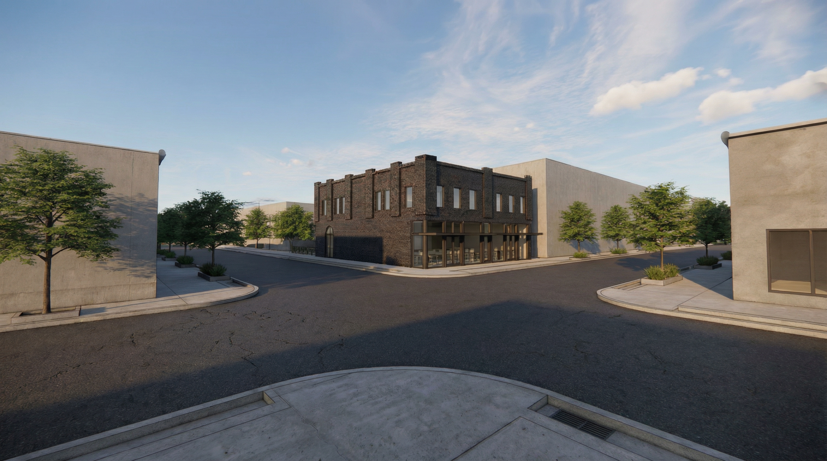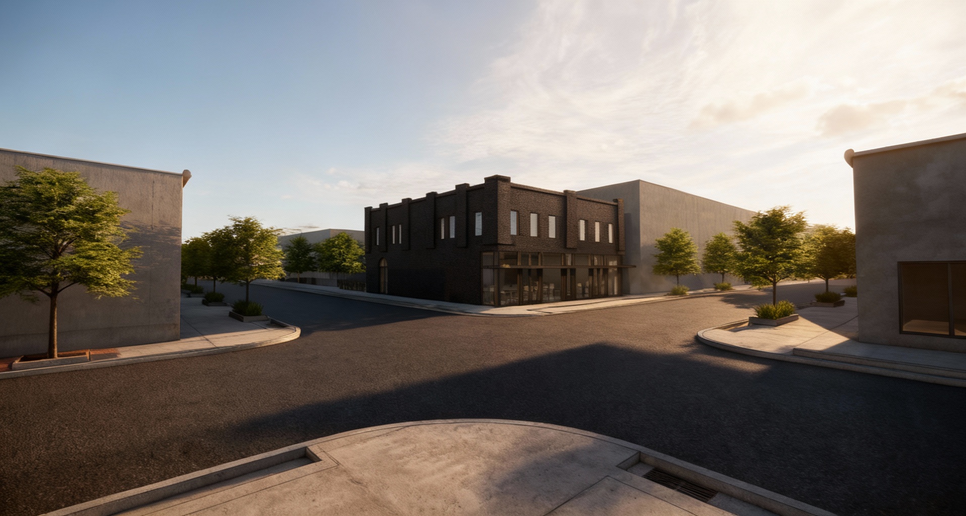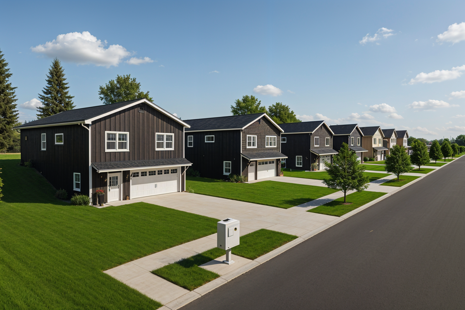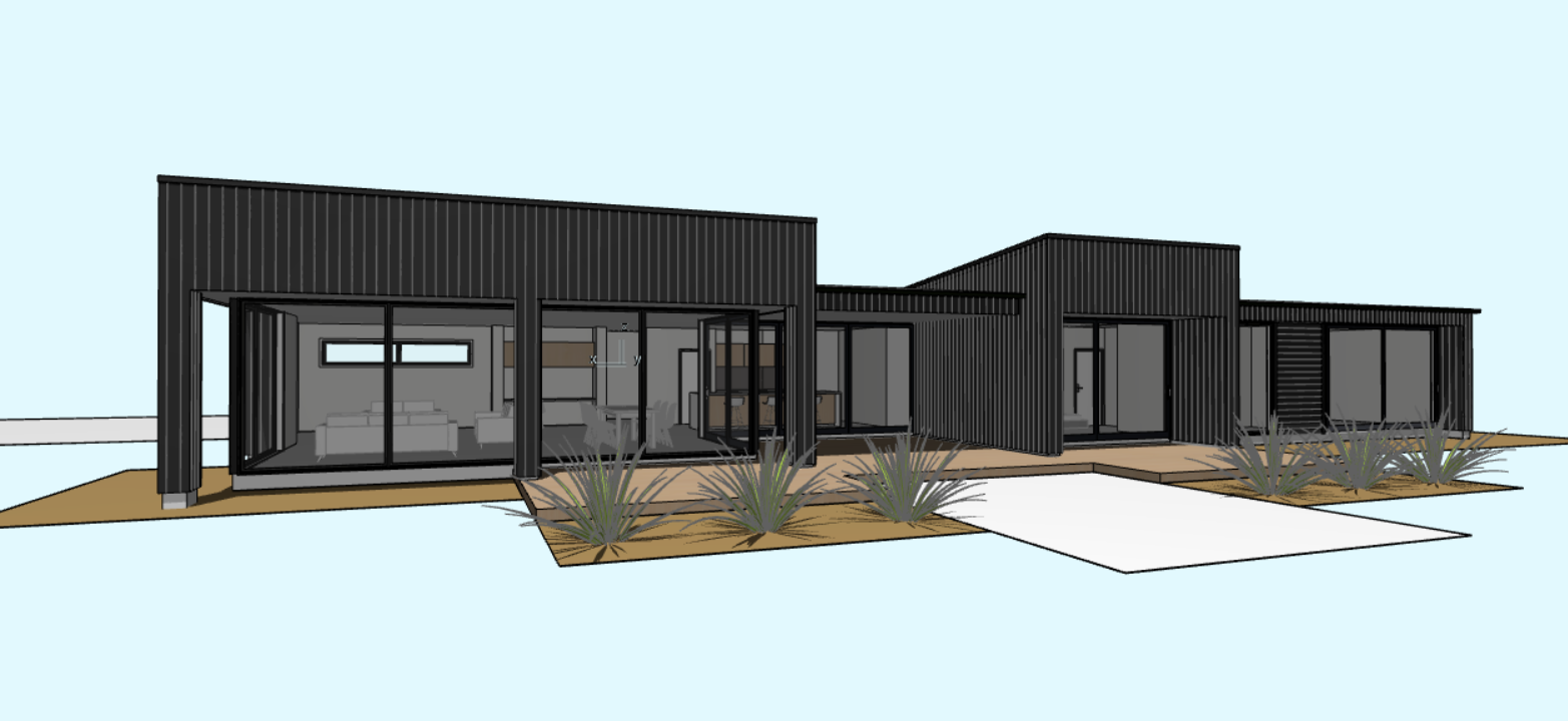 black roof vertical black timber cladding black window frames low timber deck lawns extensive native planting background trees sunset interior lights on