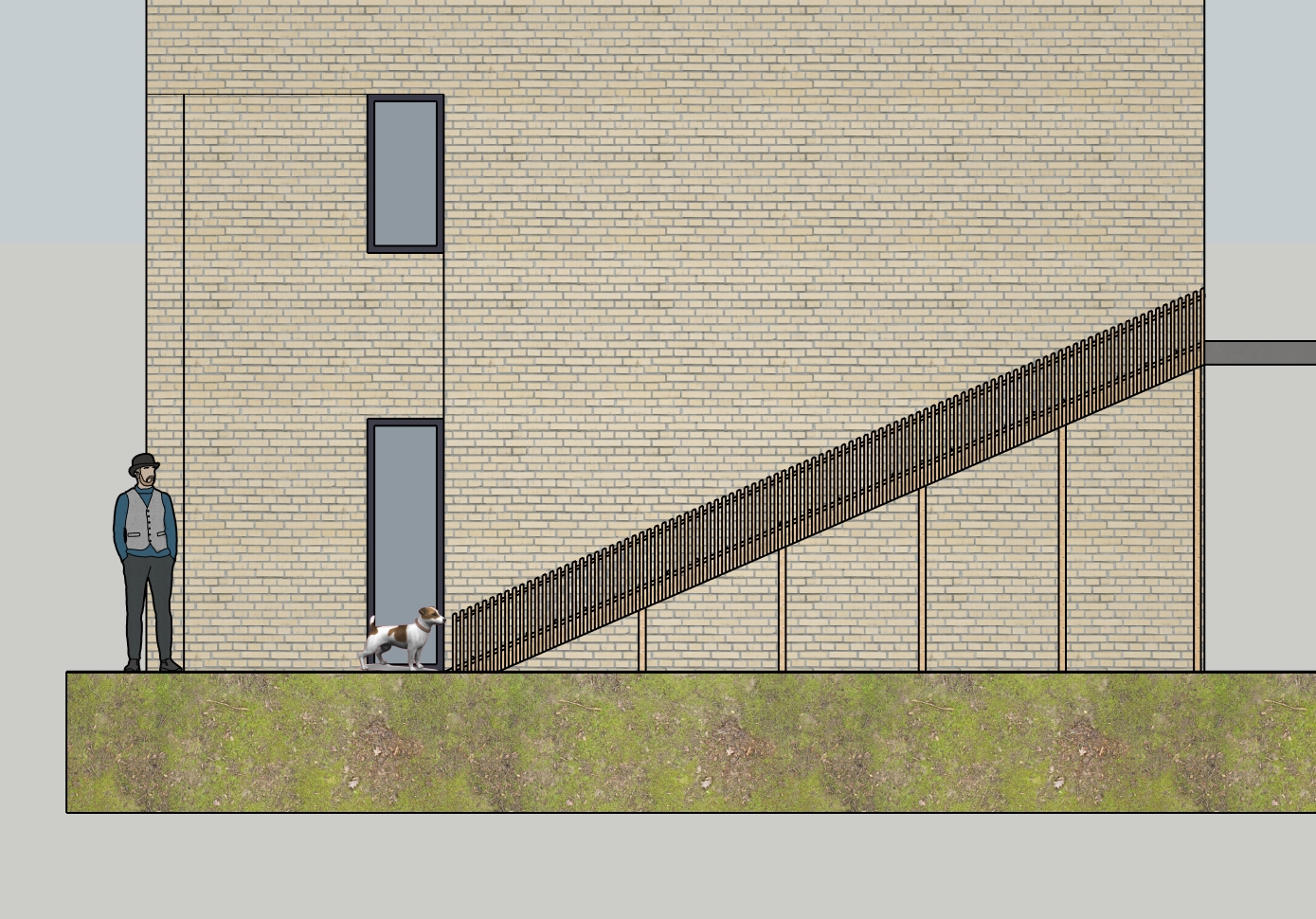 sketchup drawing to render a wooden bridge for a small dog with small wooden stacks in front of a standaard belgian house the picture is of the right facade and the platform on the right is the terrace with a fencing with a cross shape