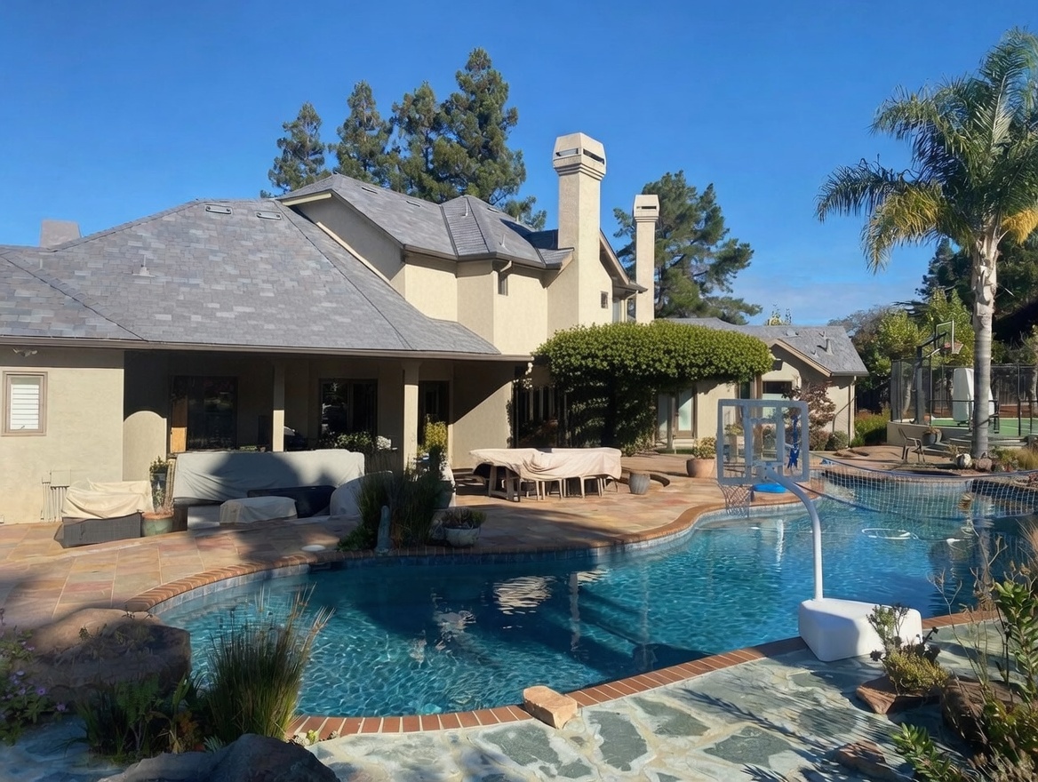 create a covered loggia in front of the house that is not connected to the main roof but stands independent of the existing structure the covered loggia should have stucco over the columns and be made of 8x8 posts place skylights in the roof to show the light coming into the space below the roof should be flat the flat roof should have a ceiling of 10 0