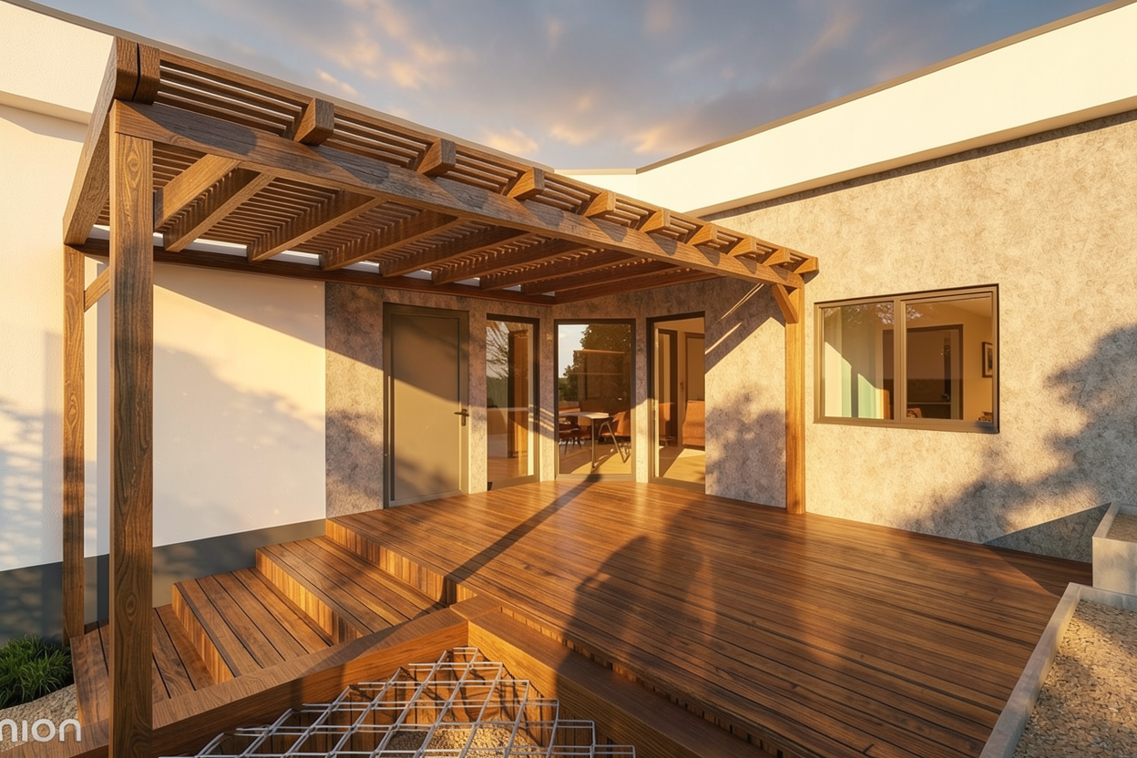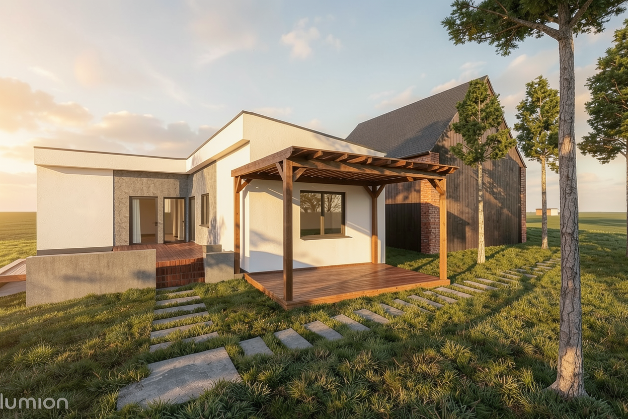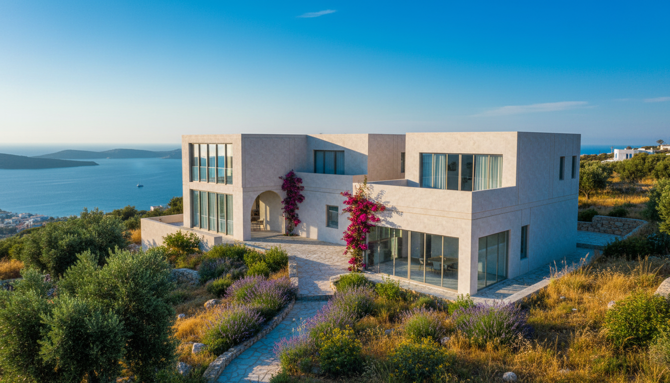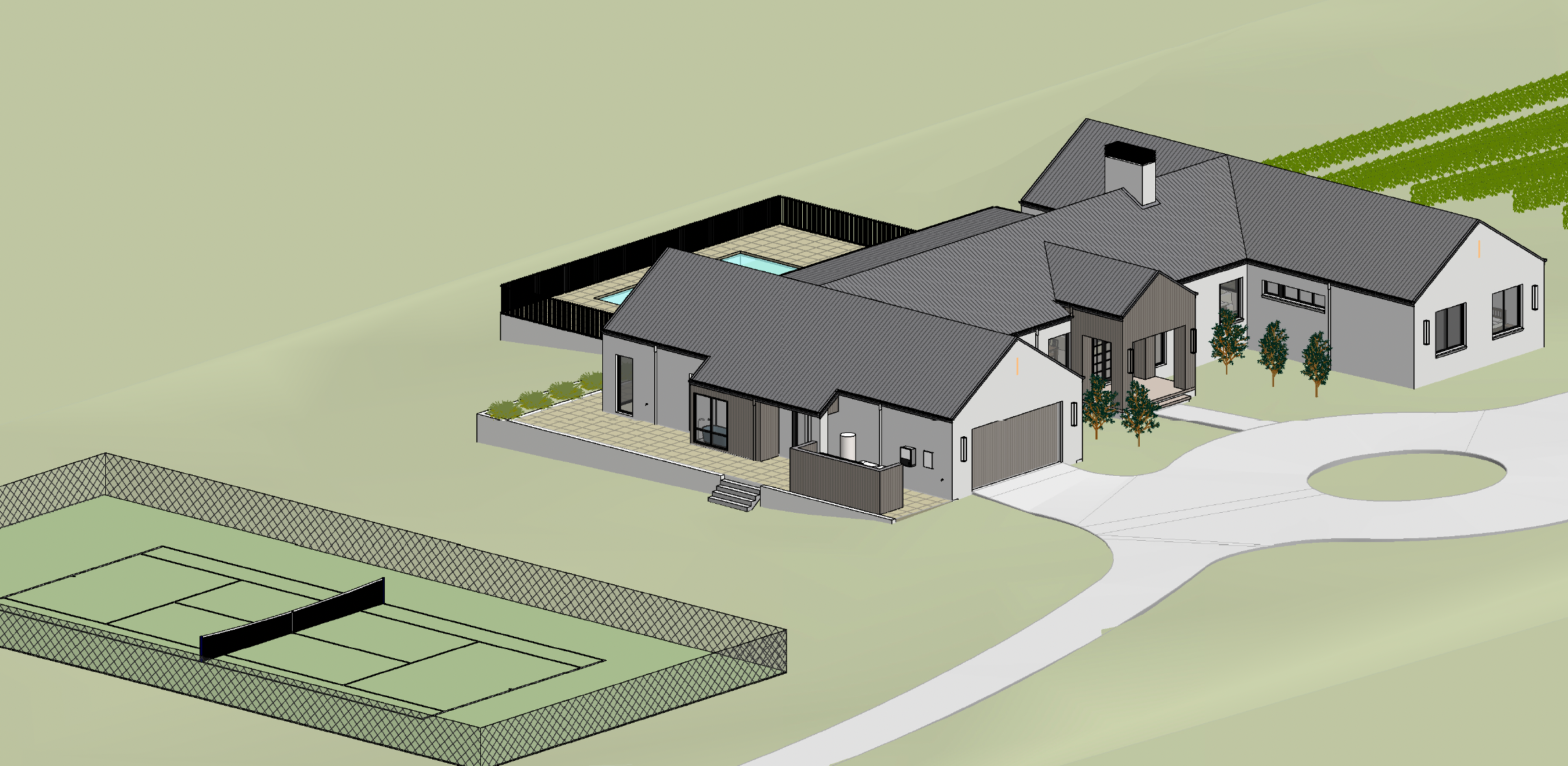 hyperrealistic aerial architectural render bird s eye 45 degree angle modern single storey australian farmhouse white painted brick charcoal colorbond multi gable roof rectangular pool to rear tennis court to left vineyard rows to right golf green in far paddock curved driveway from road shed cottage visible near entry surrounded by open cleared paddocks and native eucalyptus trees rural nsw aerial view bright midday light high detail