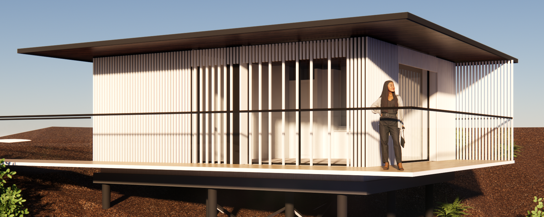 important preserve the existing geometry and the existing context exactly as provided do not modify alter reinterpret add remove scale or reshape any geometry the cladding material is dark gray wood posts soffit is wood clear