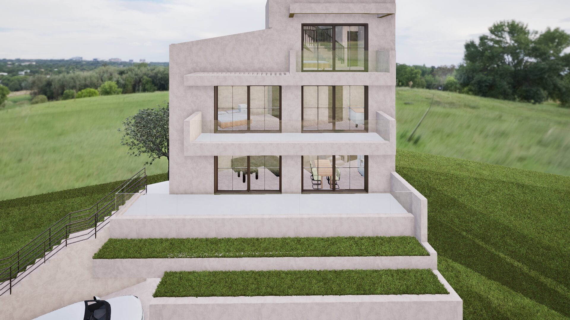 make it realistic add two people on the balconies add curtains behind the windows add short mediterranean vegetation on the grass add outdoor furniture on the balconies don t add vegetation on the first balcony