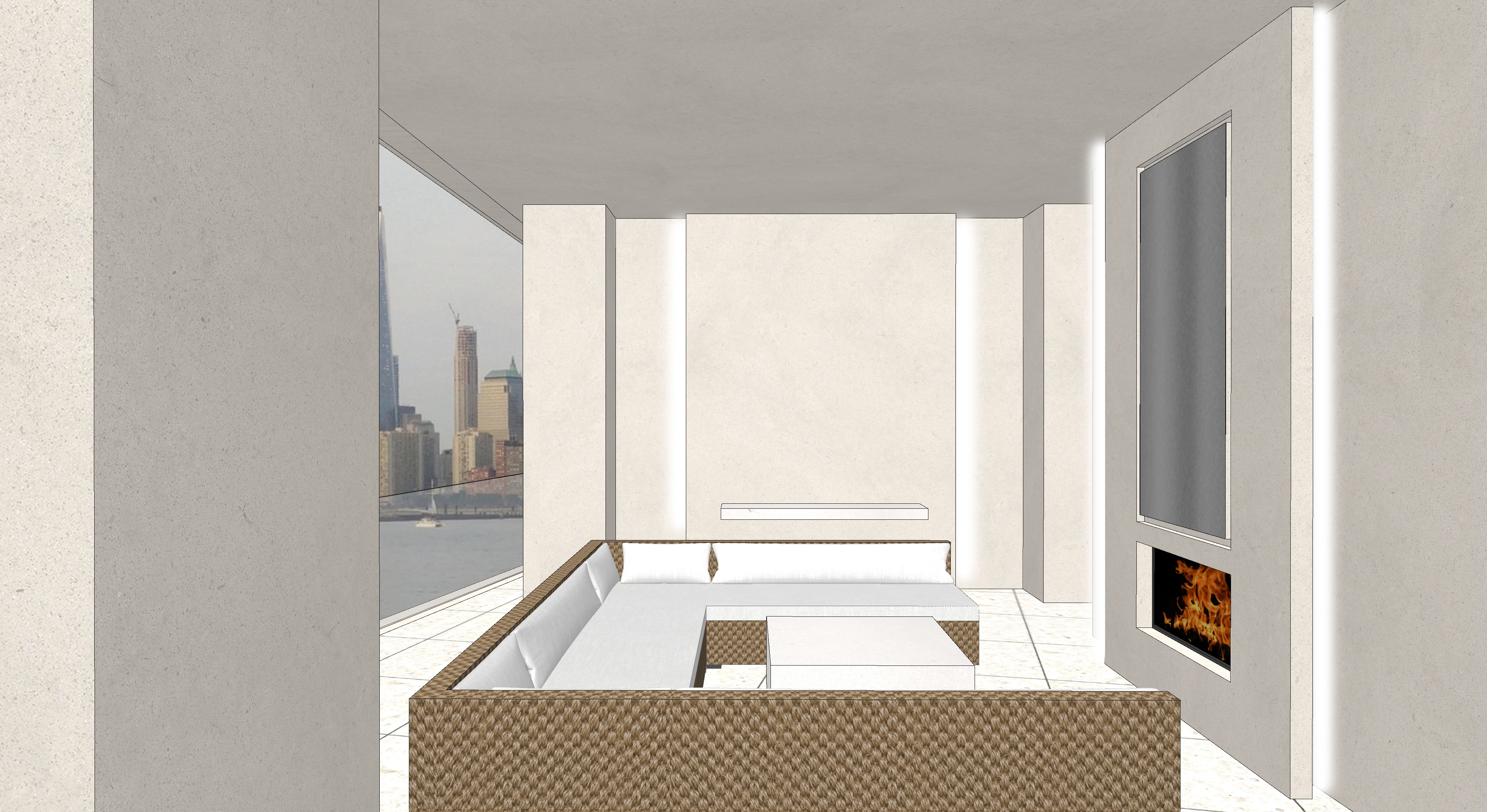 mirror with lighting behind recessed in a niche over fireplace warm light emitting from sides of walls as indicated with white glow soft afternoon lighting