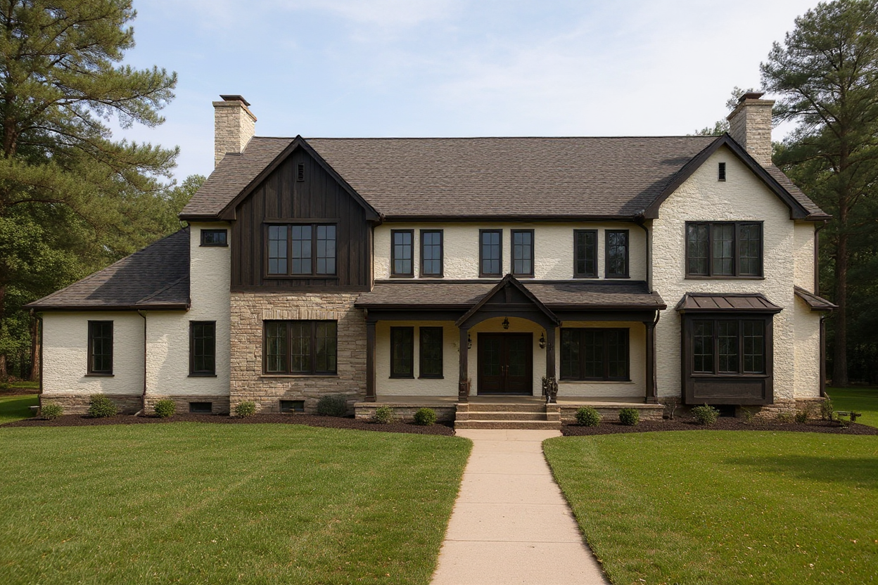 nordic exterior shot render a modern minimalist house with a clean geometric design the walls are crisp white and the roof incorporates shades of light gray the entrance features a wooden archway in rich oak brown complementing the dark chocolate colored pathways surround the scene with an ambiance of tranquil serenity bathed in soft golden afternoon sunlight that casts gentle shadows enhancing the architectural details the overall atmosphere is peaceful and inviting with a clear blue sky as the backdrop architecture