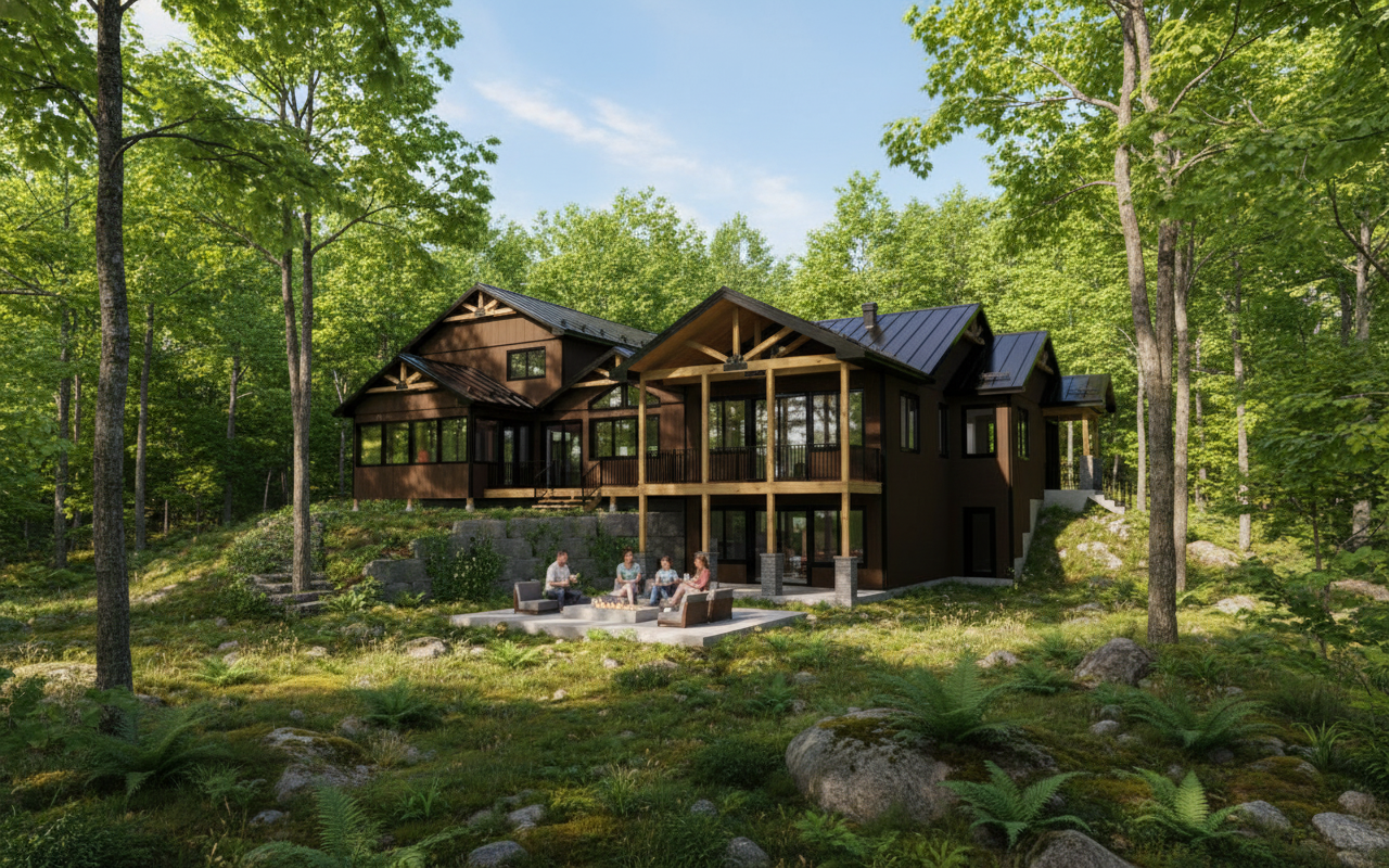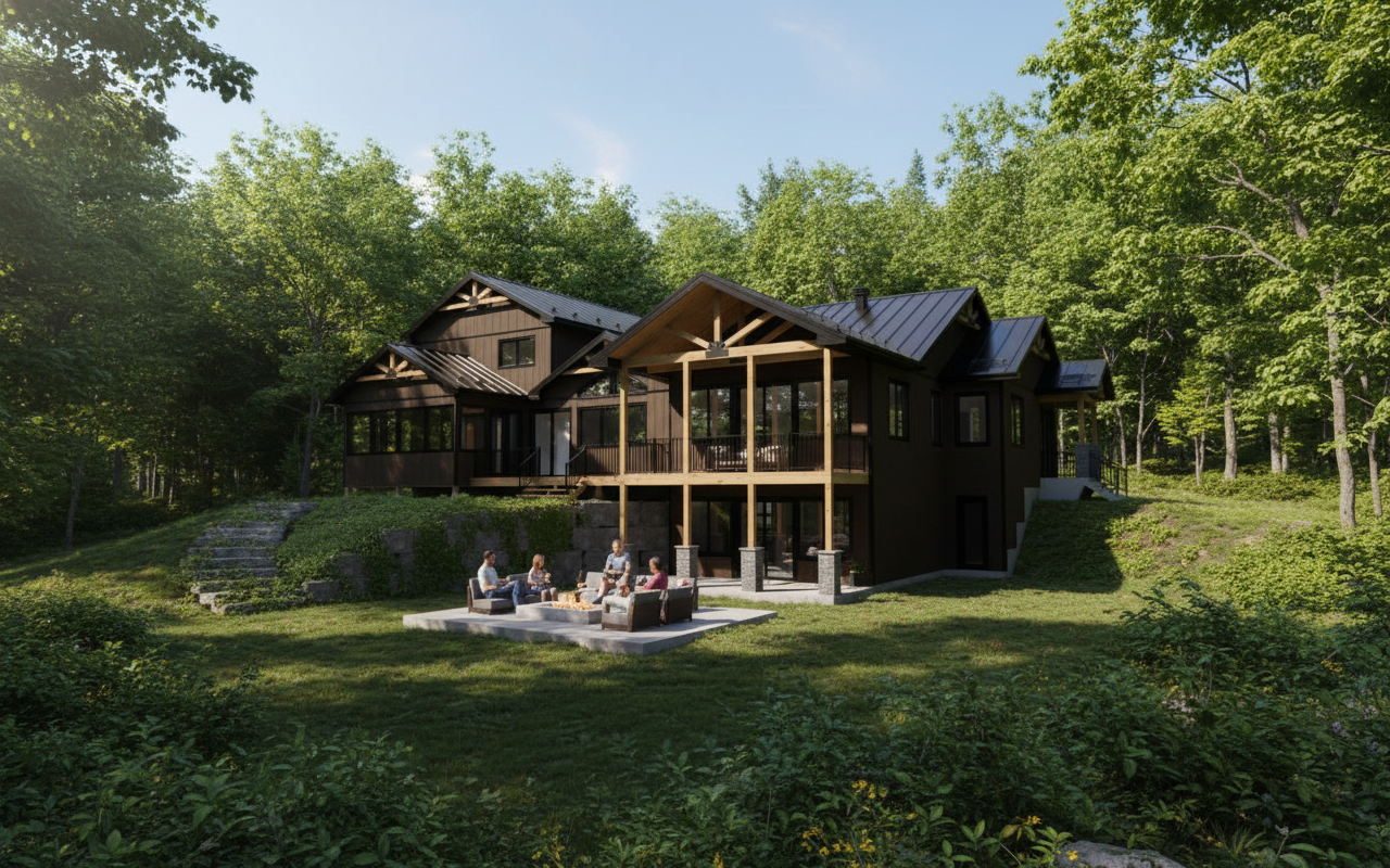 ultra realistic 4k render house in a forest in mont tremblant summer at midday black wooden cladding