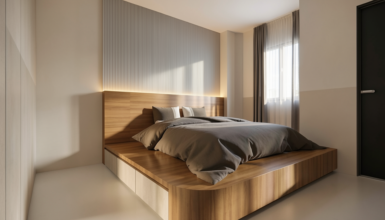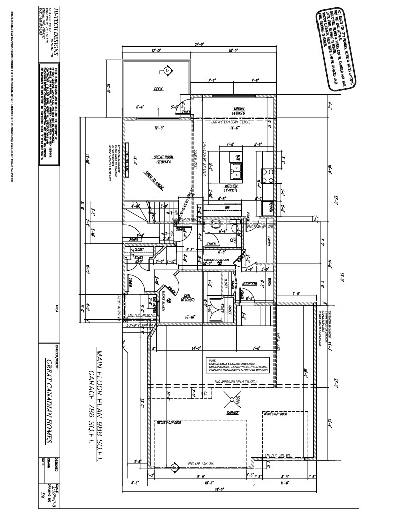 convert this floor plan into a realistic isometric 3d view of a full house show the space from an elevated angle with furniture walls and details visible realistic 3d floor plan layout of the main floor of a single family home 988 sq ft living space the layout includes the following rooms and spaces great room 12 0 x 14 4 open to above located centrally with staircase adjacent dining room 14 0 x 9 6 open to the kitchen with an engineered flush beam above kitchen 11 4 x 11 4 includes island refrigerator and pantry alcove adjacent to dining pantry off the kitchen on the east side den flex room 10 10 x 9 0 located near the front entry can serve as office or bedroom mudroom near the rear garage entry with closet and bench area 2 piece bathroom near the mudroom den area coat closet near main entry deck approx 12 0 x 10 0 accessible from the dining area via sliding door triple attached garage 34 0 wide non rectangular footprint with the left two stall side being 23 0 deep and the right single stall side being 26 6 deep creating a stepped rear wall two overhead doors one 18 x9 double wide door on the left covering two stalls and one 8 x9 single door on the right for the third stall finished interior with insulated walls and ceiling 12 7mm gypsum board with vapour barrier engineered raised beam across the garage opening use the same furniture as shows on the plan do not change the orientation of the floorplan