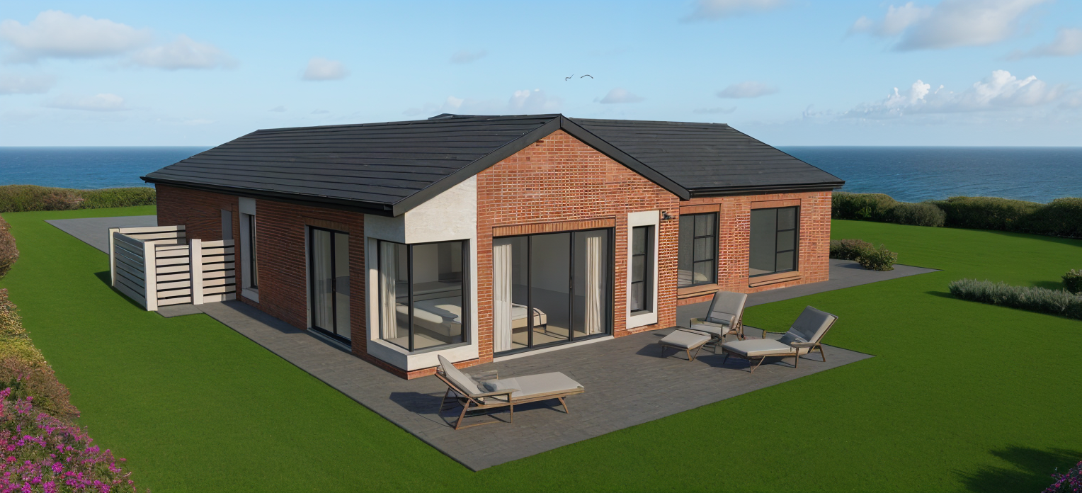 exterior shot create a photo realistic 3d rendering with texas landscape a composite black grey shaker style roof architecture