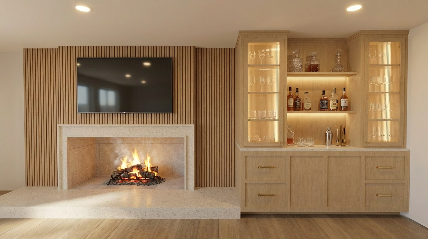 it s important to keep the sizes of everything the same change textures and materials but keep the sizes of everything the same make rock realistic its important to keep to scale this room is big do not change size of windows or doors do not add doors or windows do not change or add fixtures warm modern luxury kitchen large waterfall island with light gray marble or quartzite subtle veining polished finish thick countertop profile full height slab waterfall edges light natural wood cabinetry mixed with painted off white cabinets flat panel doors minimal hardware integrated appliances soft warm lighting oversized pendant lights with pleated fabric shades and brushed brass accents tall brass faucet neutral color palette creamy whites warm taupes light wood tones wide plank oak flooring clean and minimal styling high end residential design soft ambient glow architectural visualization ultra realistic 8k detail add tile back splash between base cabs and upper cabs add large art piece on big back wall dont put furniture against big back wall