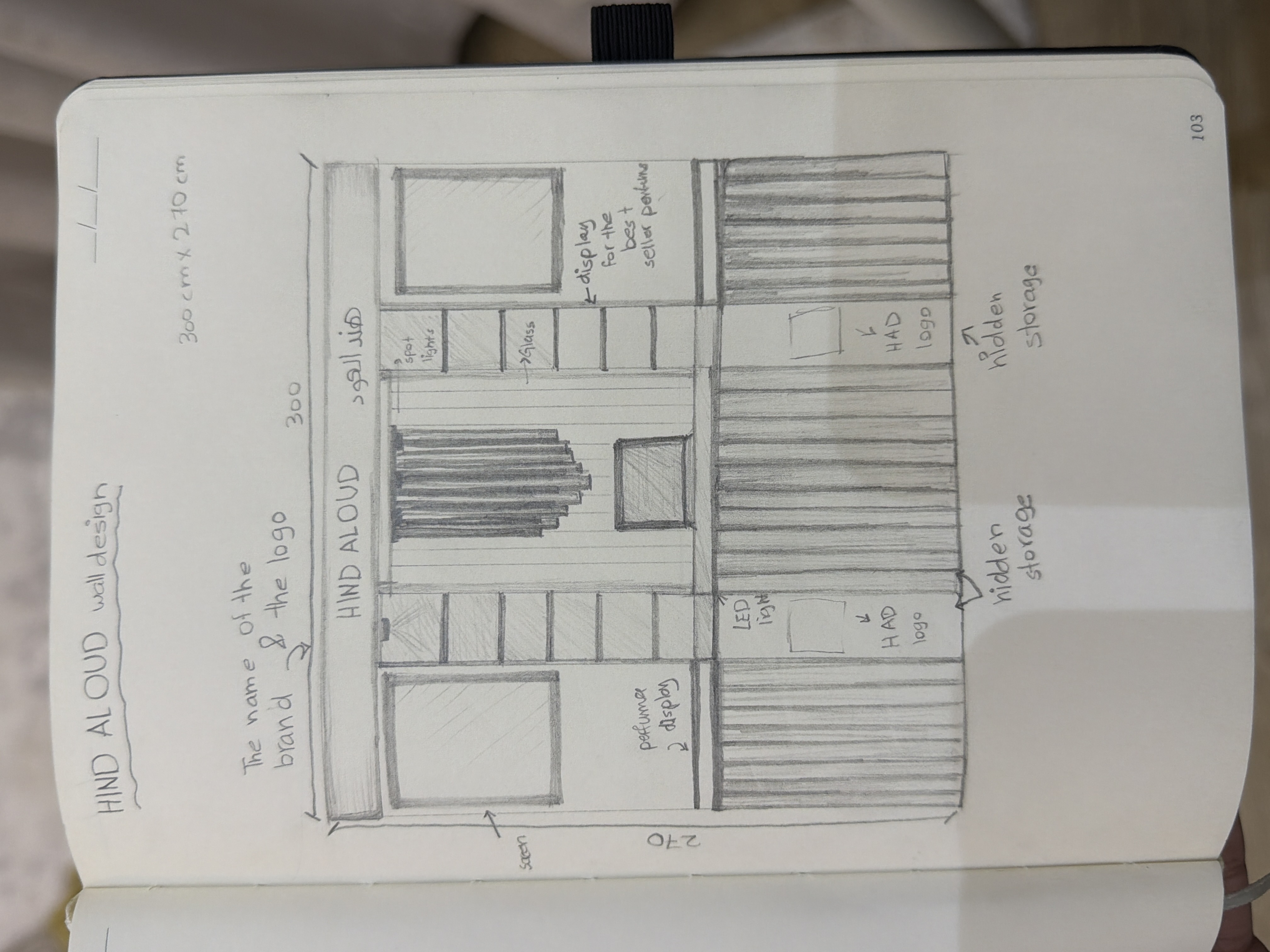 perspective shot using grays and blacks with accents of a textured matt frosted glass forthe long panels this is a perfume stand for hind al oud perfumes