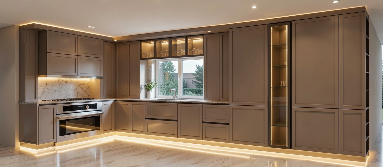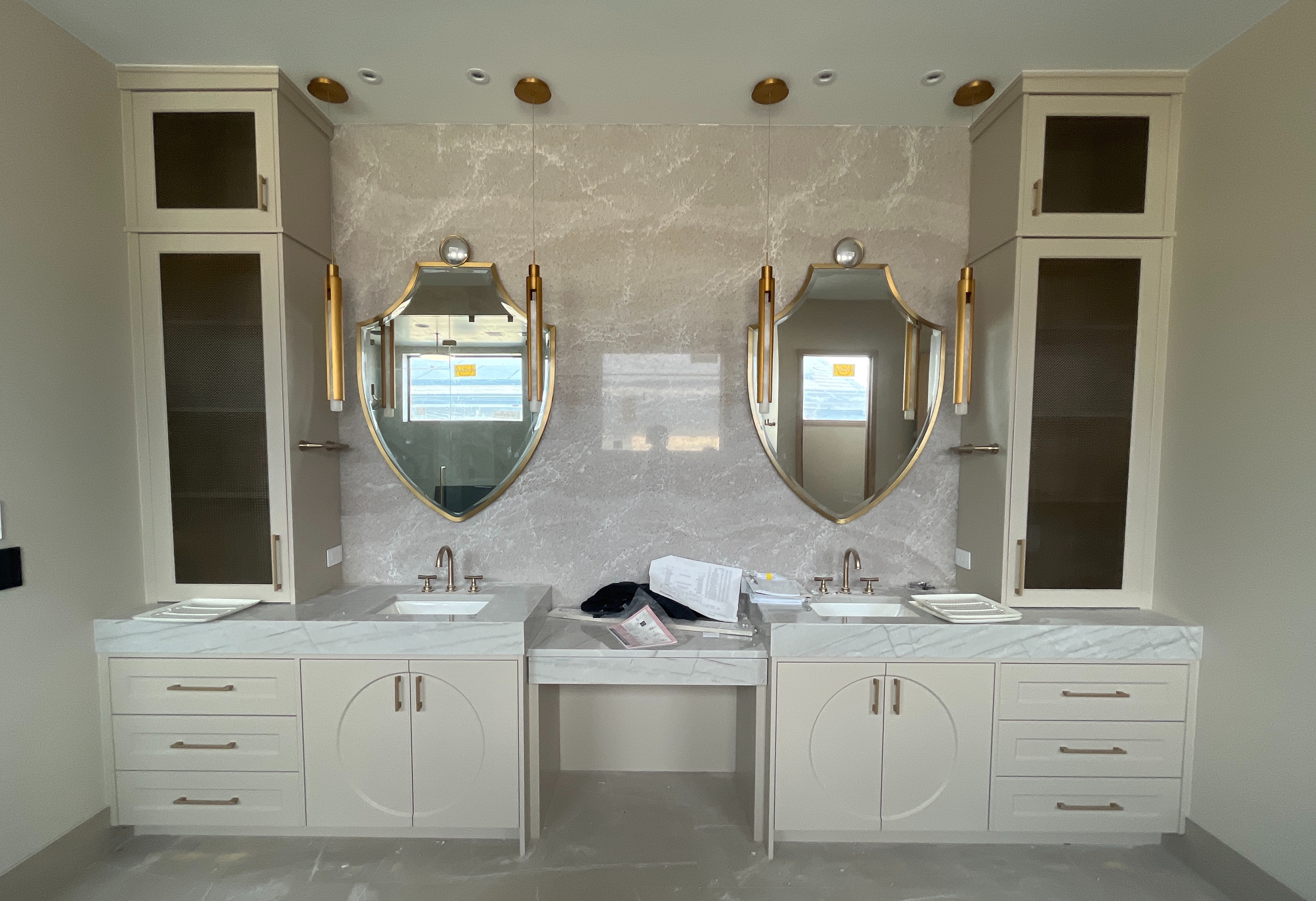 do not change the cabinets in any way preserve the exact cabinet colors materials finishes dimensions door and drawer styles hardware spacing alignment and all geometry exactly as shown do not alter the countertop shape backsplash appliances flooring lighting fixtures or wall structure only remove the construction materials clutter and mess from the scene clean the room and make it look finished and staged add a few simple tasteful home accessories appropriate for the style of the space but do not add or remove any furniture windows or architectural elements maintain the original lighting direction and realism enhance clarity and polish the photo while keeping the cabinetry and room design completely unchanged do not alter the lighting to keep the cabinet colors as they are in the image turn the lights on stage for a luxurious master bathroom add a stool in the opening
