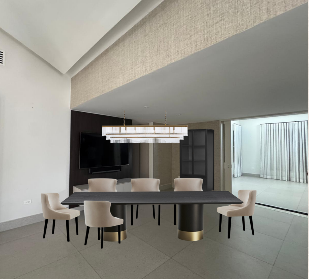 please eliminate the tv unit and put the dining room with a rug under in the same angle as the cabinet