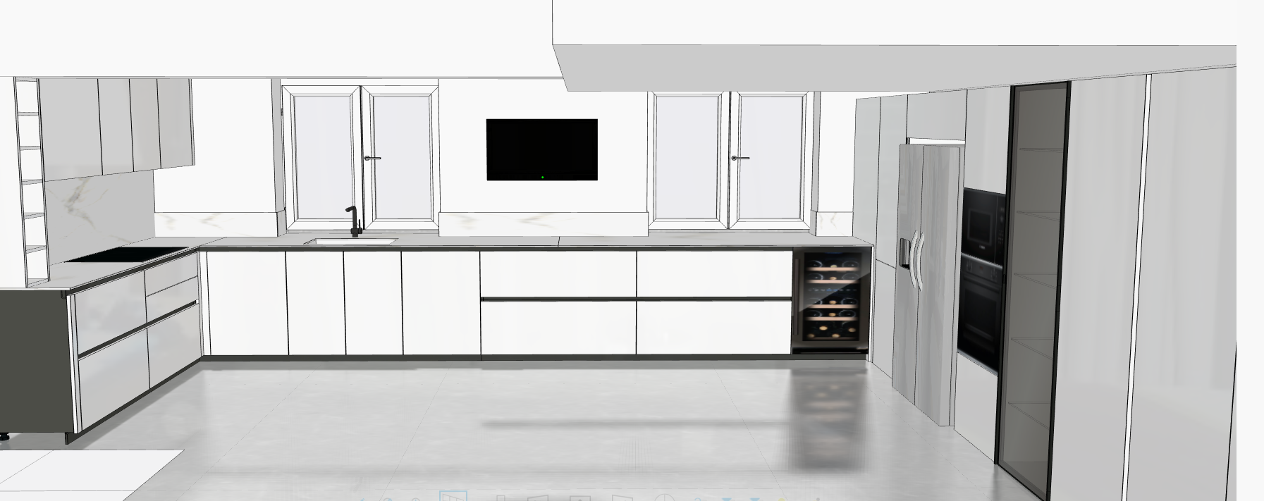 photorealistic render of a modern l shaped kitchen strictly preserving the original geometry layout and proportions of the model materials tall units on the right in glossy white glass highly reflective with realistic depth and subtle light refraction base units and wall units in glossy white lacquer smooth clean and uniform finish countertop and backsplash in laminam calacatta michelangelo porcelain stoneware white base with soft warm grey veining natural satin finish appliances built in black oven and microwave with realistic reflections integrated wine cooler with glass door and visible bottles soft internal lighting lighting bright natural daylight entering from the front windows above the sink soft diffused sunlight creating realistic shadows across the long countertop subtle reflections on glossy lacquer and glass surfaces balanced global illumination bright and natural avoid artificial showroom lighting environment clean elegant and contemporary kitchen space realistic light bouncing on floor and furniture soft ambient occlusion to enhance depth under cabinets and along edges slight depth of field for a photographic look realism details very subtle imperfections on glossy lacquer to avoid plastic look accurate glass refraction and reflections on tall units well defined but natural marble veining not exaggerated neutral color balance no overexposure on white surfaces camera wide angle lens 28 32mm camera height approx 155 165 cm frontal perspective slightly angled to show both the linear run and the left corner keep vertical lines straight no distortion quality ultra realistic render high detail pbr materials global illumination ray tracing soft shadows realistic reflections