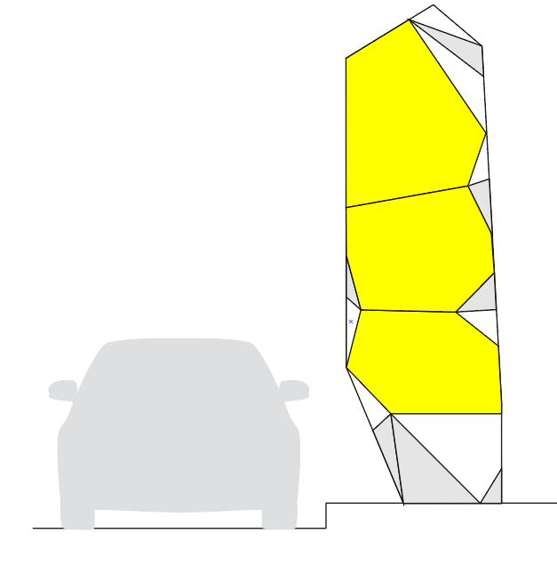 convert this signage design graphic into a realistic 3d external pylon signage and stage it within an outdoor environment show it in a dynamic perspective view positioned by the roadside with a partial view of a car on the road beside the signage for scale the signage panel is made of aluminum with a hairline rose gold finish featuring subtle bends and curves as indicated by the shading in the design reference signage dimensions 1170 mm wide 3610 mm tall render in archsynth architectural realism natural daylight cinematic depth accurate reflections photorealistic materials and cohesive lighting integration with the outdoor environment panel in yellow color to be flat surface