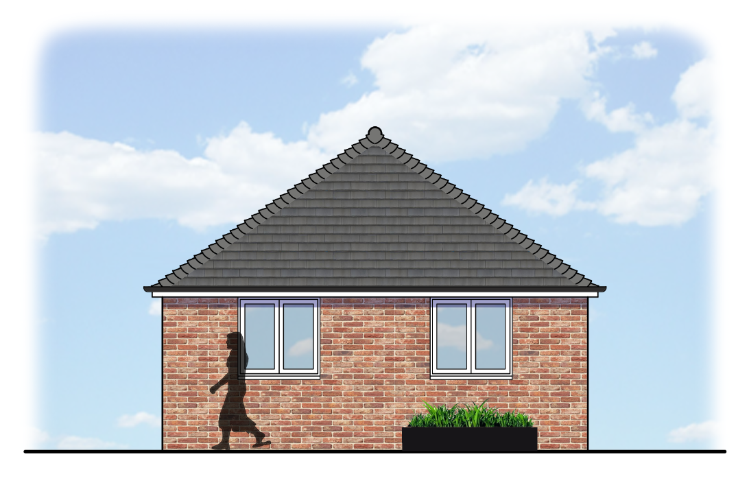 create a 3d visualisation keeping all materials and design the same set it on a residential street slightly set back from the pavement and with a bungalow to the left and a bigger house to the right side