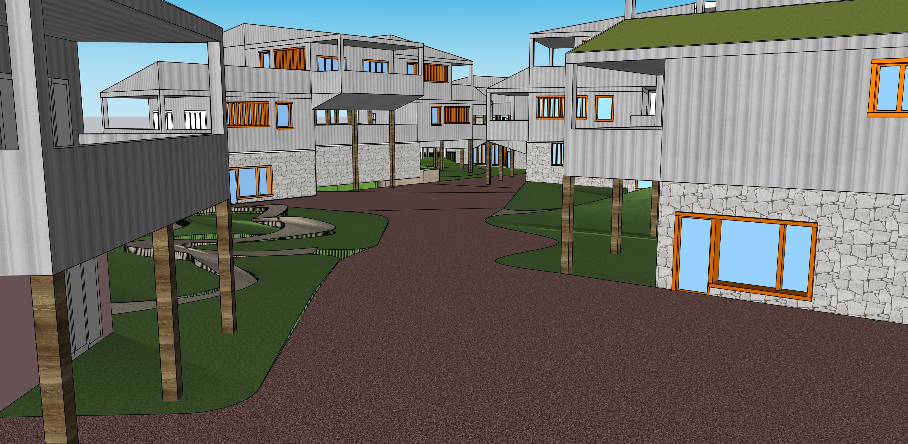 create a serene architectural rendering of a hillside community with modern minimalist buildings the buildings are made of light gray corrugated metal with stone bases and feature wooden accents in warm earthy tones the large windows reflect a soft blue sky the ground is covered in lush green grass with winding stone pathways the path is a subtle rich brown adding depth to the landscape the atmosphere is peaceful and tranquil evoking a sense of harmony with nature soft natural lighting enhances the warm and inviting atmosphere architecture