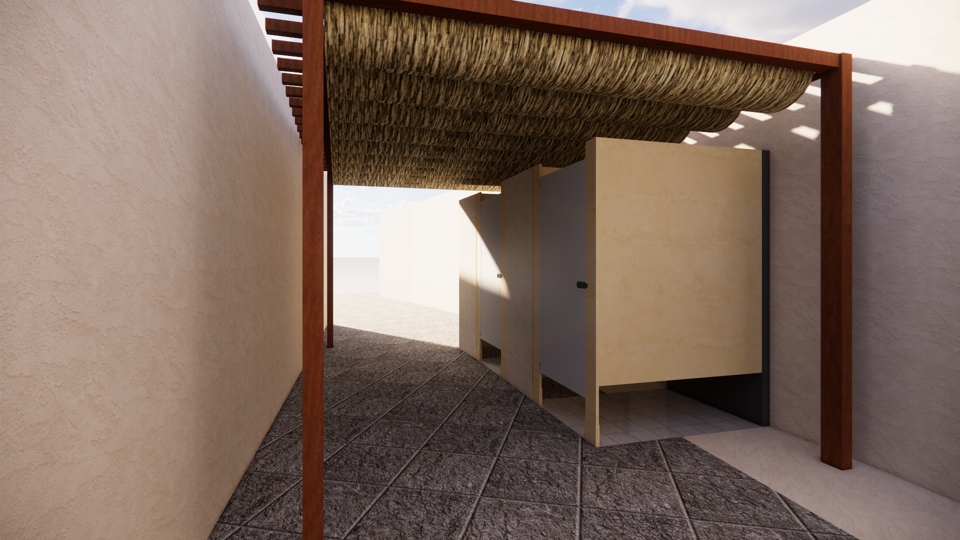 a set of outdoor bathroom stalls for a luxury caf and hookah lounge on venice road djibouti asta studio the architecture follows the same arabic modern design language as the rest of the project earth toned stucco arched forms and refined natural materials that blend function with elegance each stall is enclosed in warm beige stucco walls with a soft tactile finish featuring arched doorways or arched recesses for ventilation that echo the caf s architectural rhythm the doors are made of wood or textured bronze panels adding depth and warmth integrate discreet backlighting or wall mounted sconces that cast a golden ambient glow creating an inviting nighttime atmosphere the lighting should highlight the arches textures and shadows maintaining a sense of luxury even in a utilitarian space surround the stalls with lush greenery climbing vines potted tropical plants or a small planted border softening the architecture and connecting it to the coastal environment the flooring can be natural stone terracotta tiles or microcement durable yet elegant the overall mood refined serene and cohesive extending the main lounge s arabic inspired modern elegance into a tranquil outdoor experience the stalls should feel private yet open harmonizing luxury hospitality design with the natural light and breeze of djibouti s coastal setting the image should be symmetrical and atmospheric with soft evening lighting and hints of greenery and texture capturing the blend of comfort craft and sophistication characteristic of asta studio s design identity
