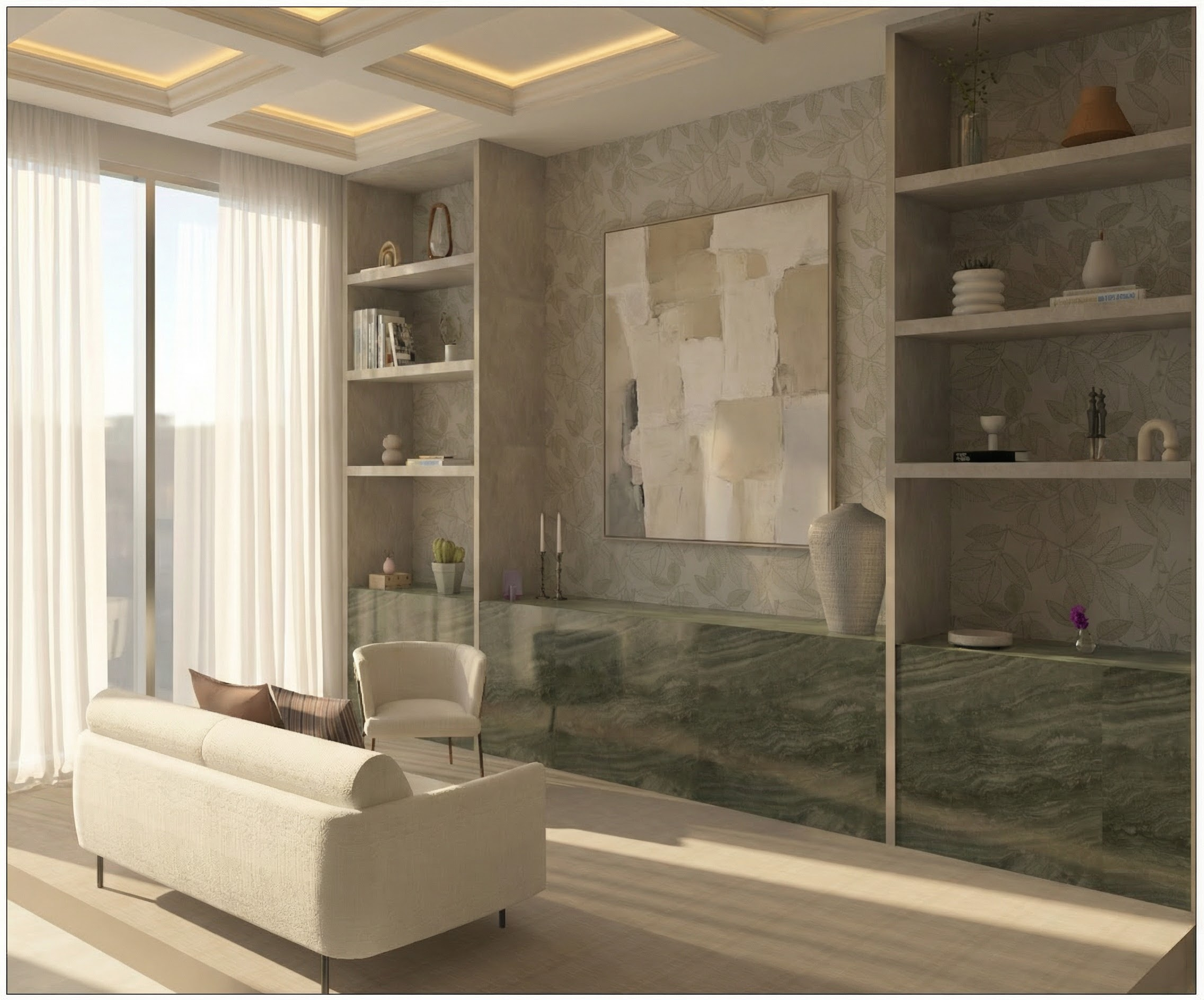 maintain all geometry and material colors create a hyper realistic sunny morning interior rendering show the ceiling white with a flat paint finish