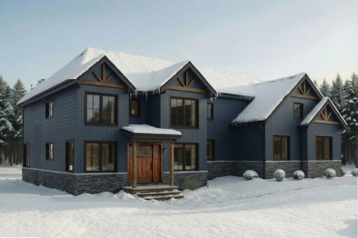 dark blue siding in its current directions make the front double door more realistic with glass panes too and have a black light fixture on both sides of the front door do not change or add anythig else make all of the snow disappear and a spring vibe
