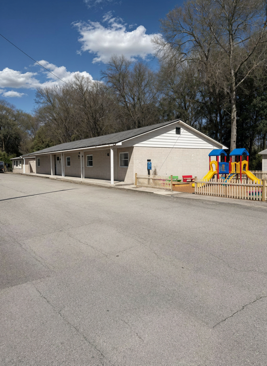 make the parking lot new with crosswalk make the playground more modern and green add colorful mural to wall of the building