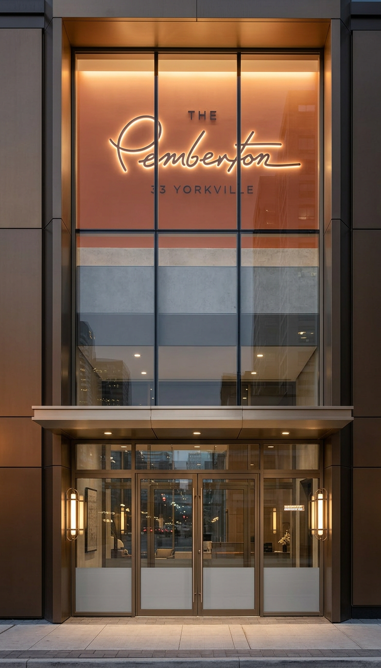 maintain the existing proportions and architectural elements from the model a rectangular canopy projecting above the entrance glass curtain wall above the canopy revealing the slab of the upper floor behind the curtain wall there is a wall in a warm orange brown tone with the building logo centered and backlit with soft led lighting the main entrance doors below the canopy should be glass with elegant metal framing materiality and style facade cladding in dark bronze warm brown metal panels with subtle joints canopy structure finished in brushed bronze or dark champagne metal glass should look clear and reflective showing subtle interior reflections feature wall above should be painted in a warm terracotta burnt orange color lighting very important warm architectural lighting 3000k integrated above the canopy washing the upper wall and curtain wall recessed downlights under the canopy creating a n ambiance similar to a luxury hotel entrance and lighting on top of the canopy to wall wash curtain wall soft led backlighting behind the logo on the orange brown feature wall wall sconces as the reference image on the sides of the entrance atmosphere and realism evening or dusk setting to emphasize lighting cinematic lighting and reflections on the metal and glass highly realistic materials global illumination and soft shadows luxury residential aesthetic similar to a high end hotel or yorkville condominium entrance the main entrance doors below the canopy should be glass with elegant metal framing and respect the reference proportions and openings the two middle doors must be automatic sliding glass doors remove door handles on the sliding doors as automatic sliding doors do not require handles clean urban sidewalk in front of the entrance camera eye level frontal perspective centered on the entrance slightly wide architectural lens 24 35mm symmetrical composition highlighting the canopy and illuminated entrance