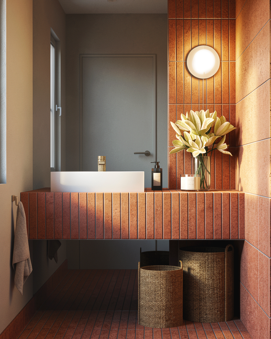 type of image high end editorial architectural photography hyperrealistic refinement core instruction absolute priority keep the image exactly as it is do not modify composition objects lighting or styling do not add or remove any elements only refine wall and door color material textures walls and door focus principal refine the wall and door to a warm white painted finish soft warm white tone slightly creamy not cold not grey matte paint finish subtle micro texture very fine irregularity not flat digital white preserve all existing shadows and light gradients maintain natural light interaction from the left window importante do not increase brightness globally do not flatten the image terracotta tiles micro refinement maintain current tone and color enhance subtle variation between tiles reinforce grainy ceramic texture controlled not noisy deepen grout lines slightly with soft shadowing avoid uniform or plastic look baskets texture only enhance woven depth improve shadow inside fibers keep exact shape and position ceramic elements sink toilet if visible matte ceramic finish soft light diffusion slightly more weight in edges avoid plastic feel glass vase subtle refraction slight distortion of stems clean but realistic transparency lighting locked keep exactly natural light from the left warm wall lamp refine only slightly improve contrast in contact areas preserve shadow depth no global brightening color maintain current warm palette avoid grey cast on whites slightly reinforce warmth without saturating style editorial photography tactile realistic material driven no cgi look restrictions critical do not add any new elements do not change flowers do not modify styling objects do not alter composition do not change lighting setup do not smooth excessively do not reinterpret the image