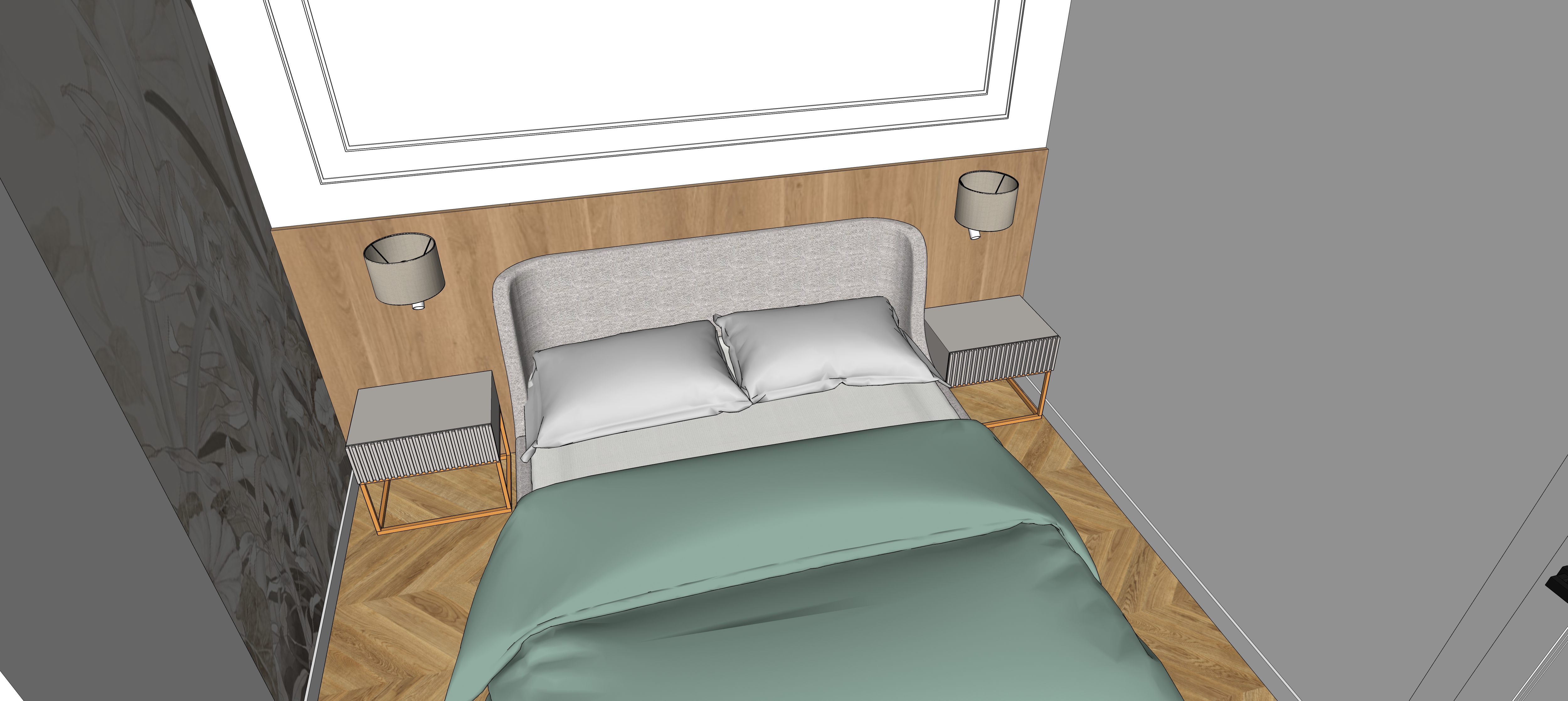 create a photorealistic visualization white walls and ceilings leave the decorative wall moldings on the wall above the bed as they appear in the original photo don t change the color of the bedside tables the bedside tables are beige replace only the yellow elements with brushed gold the wallpaper should be matte leave the pattern and color of the wallpaper as they appear in the original photo leave the bedside lamps off add a soft texture to the mint colored bedspread