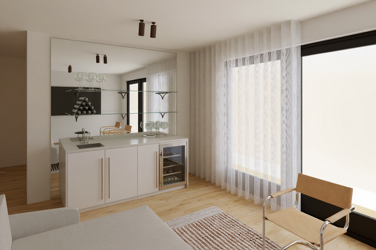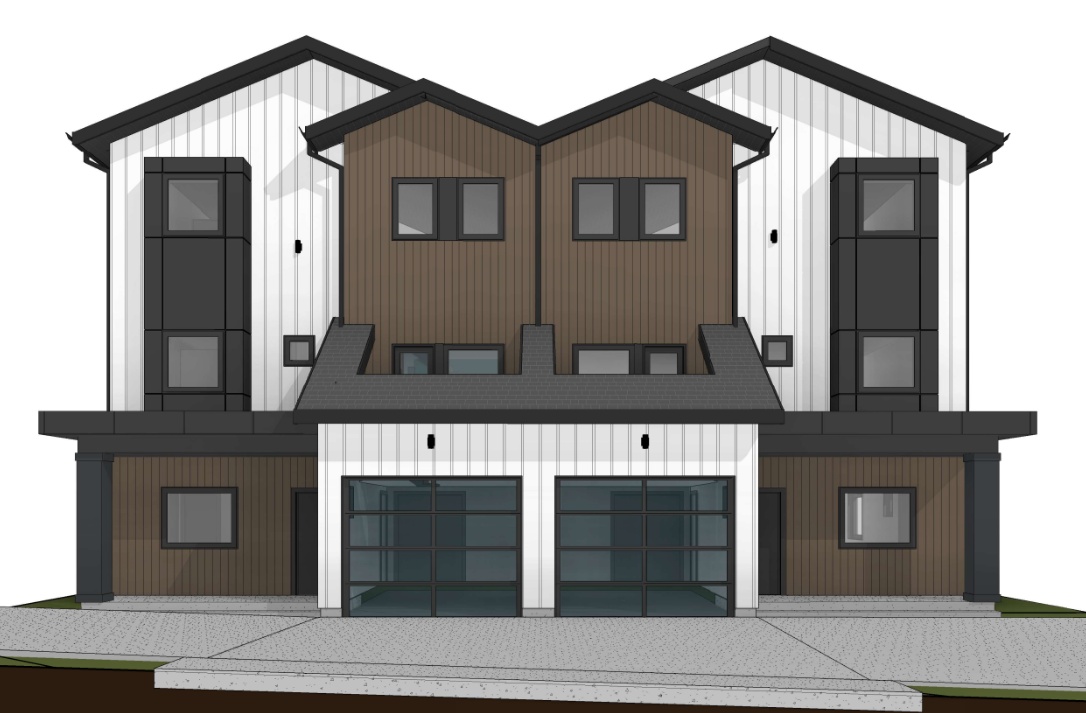 create a realistic detailed rendering of a modern duplex the duplex should feature a symmetrical design with gable roofs in a modern farmhouse style use a combination of white vertical paneling and rich brown horizontal wood siding for the exterior walls the roof and accents should be in dark charcoal gray incorporate large black framed windows and garage doors for a sleek look design a clean concrete driveway sloping to the right and integrate subtle lighting for an inviting evening ambiance opt for a clear dusk sky to create a calm serene atmosphere set in the lush seattle area with mount baker in the distance there s flocks of geese migrating south in the distance there is a family or two around going about their enjoyment the landscape features tall cedar hedges by the sidewalk large white hydrangea shrubs around the porch and white pampas grass by the driveway edges