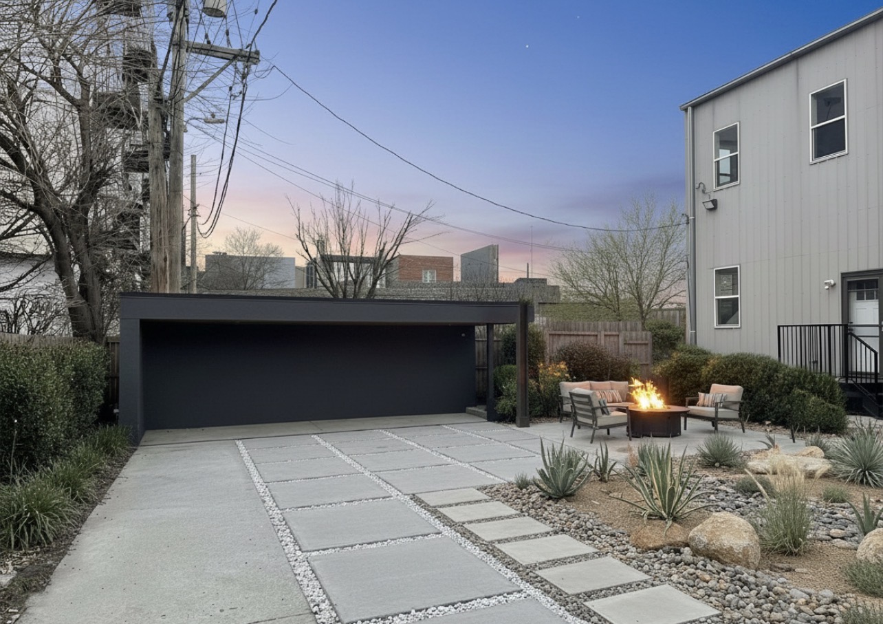 add two cars under the car power and additional wild grass to gravel area in the right replace fire pit and chairs with area beliw in center of drifmveway