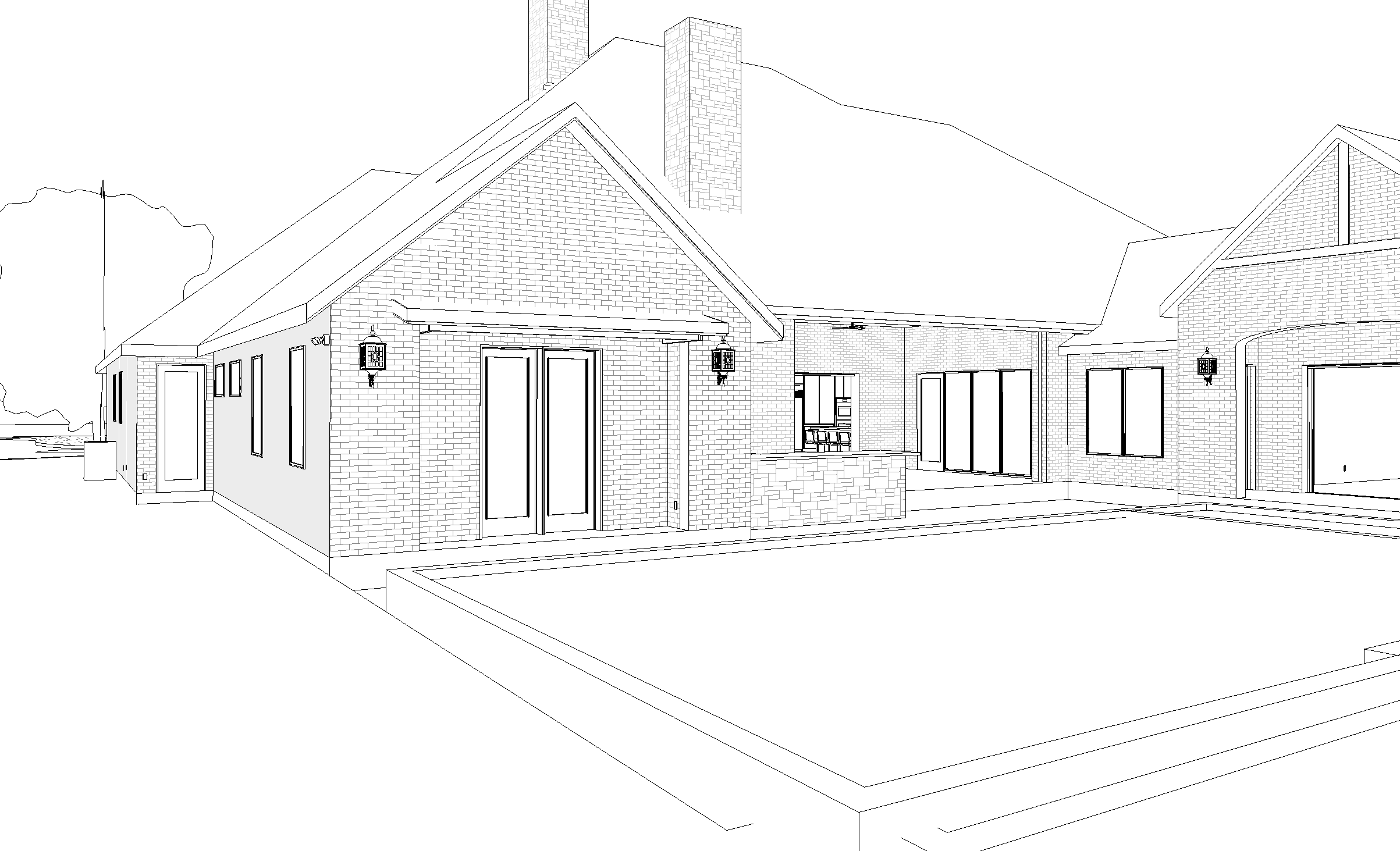 render a serene modern house exterior with a warm and inviting atmosphere the house exterior is crafted from beautiful red brick complemented by soft white mortar the roof is a sleek slate gray adding a contemporary touch the window frames and doors are a deep rich espresso brown accentuate the building with soft ambient lighting from elegant black lanterns surrounding the house lush green grass and garden beds with colorful flowers in shades of lavender and yellow add vibrancy the sky is a clear azure blue with a soft golden sunlight illuminating the scene creating a peaceful and welcoming ambiance