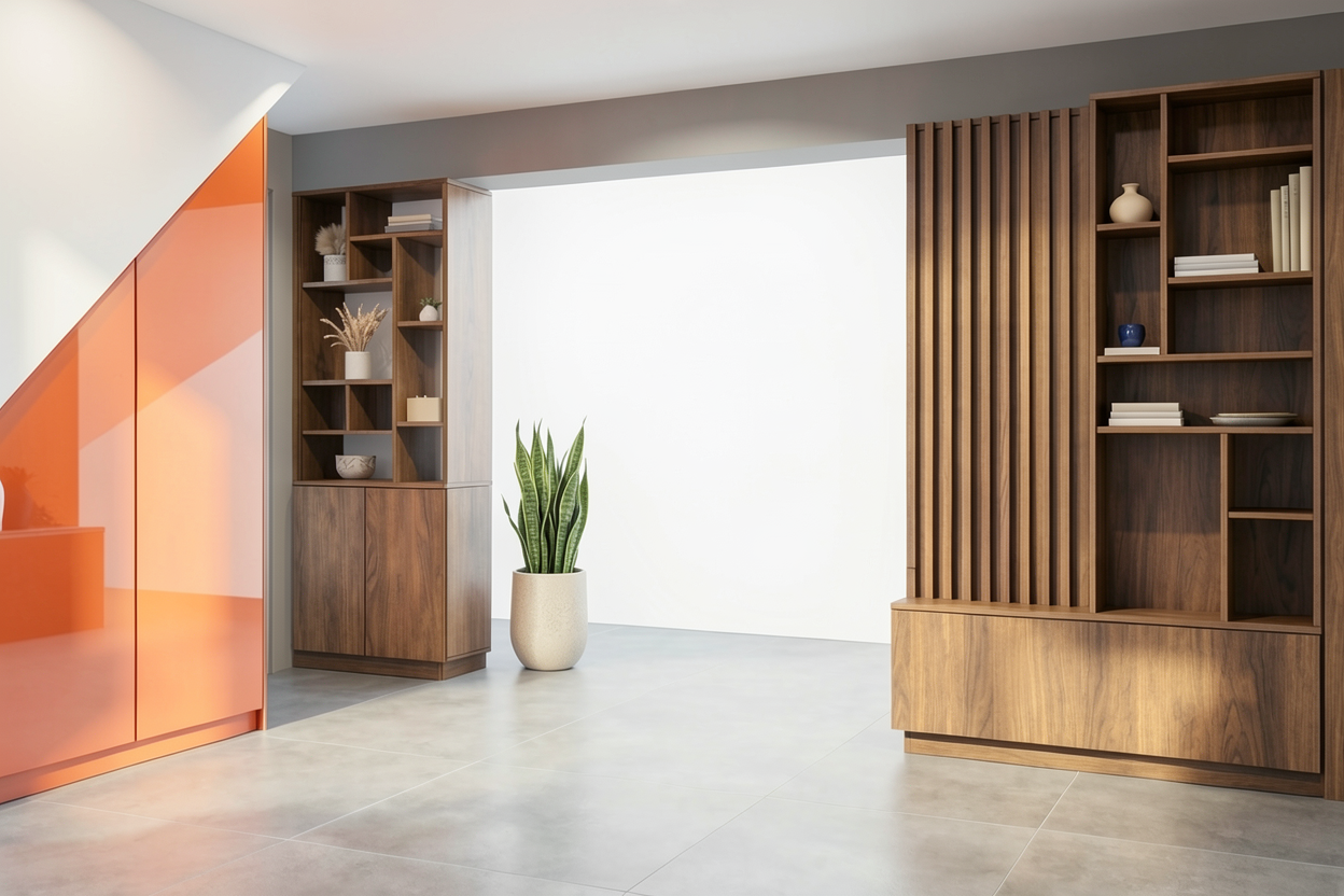 modern architecture a matte finished light grey corrugated metal fa ade grey painted sliding shutters with a steel frame and timber slats sky with little clouds midday summer wood with little patina a matte finished light grey fence with a steel frame and timber slats asphalt road gravel parking space wooden facade of gaden shed maintain colors concrete fence footing