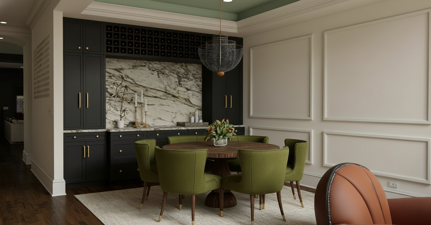 only update the green fabric on the chairs make it darker and more saturated keeping the material and texture the same do not change the lighting or anything else in the rendering