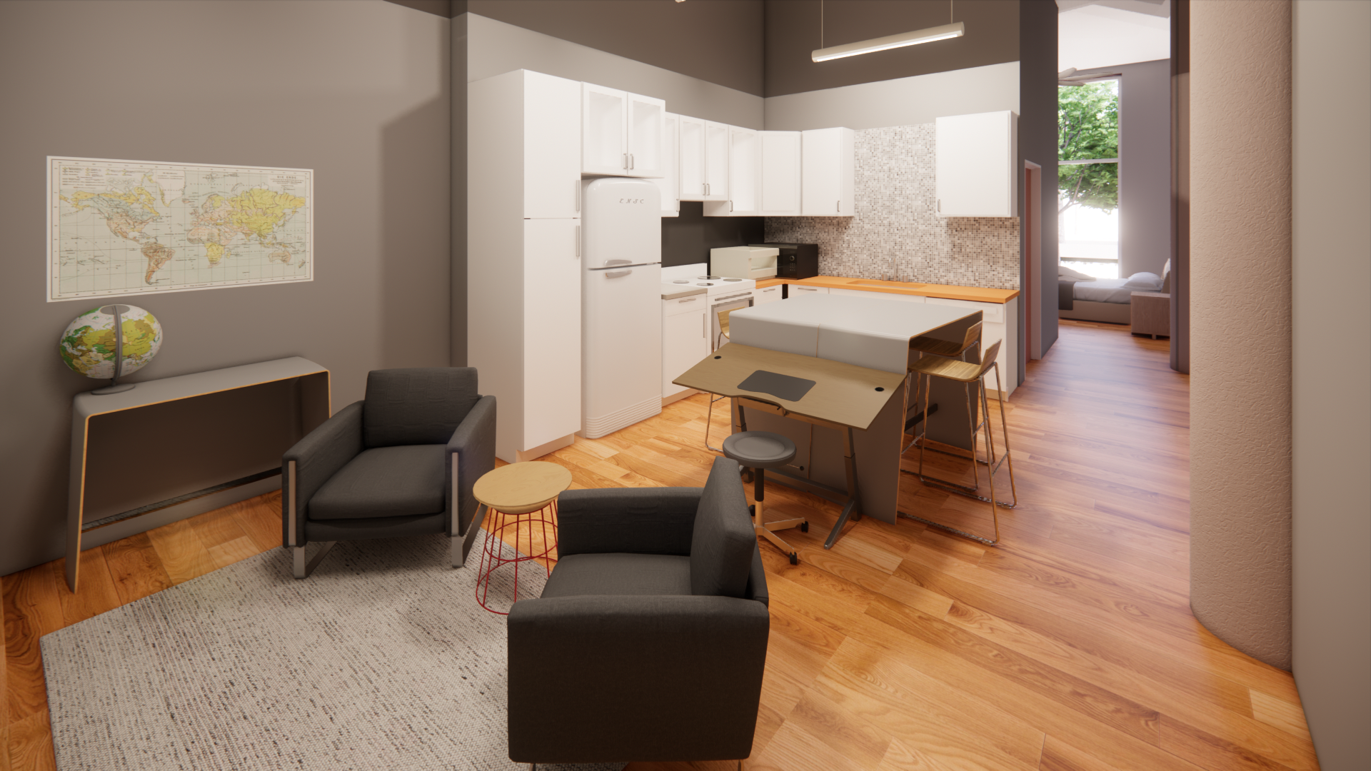 photorealistic image of a renovated apartment everything from the fabric to old refurbished wooden floors and cabinets should have texture there is a living room kitchen and bedroom down the hall