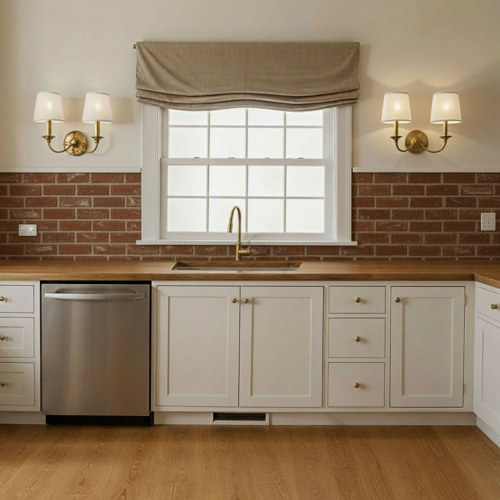 remove the sconces and add wood upper cabinets like the reference photo