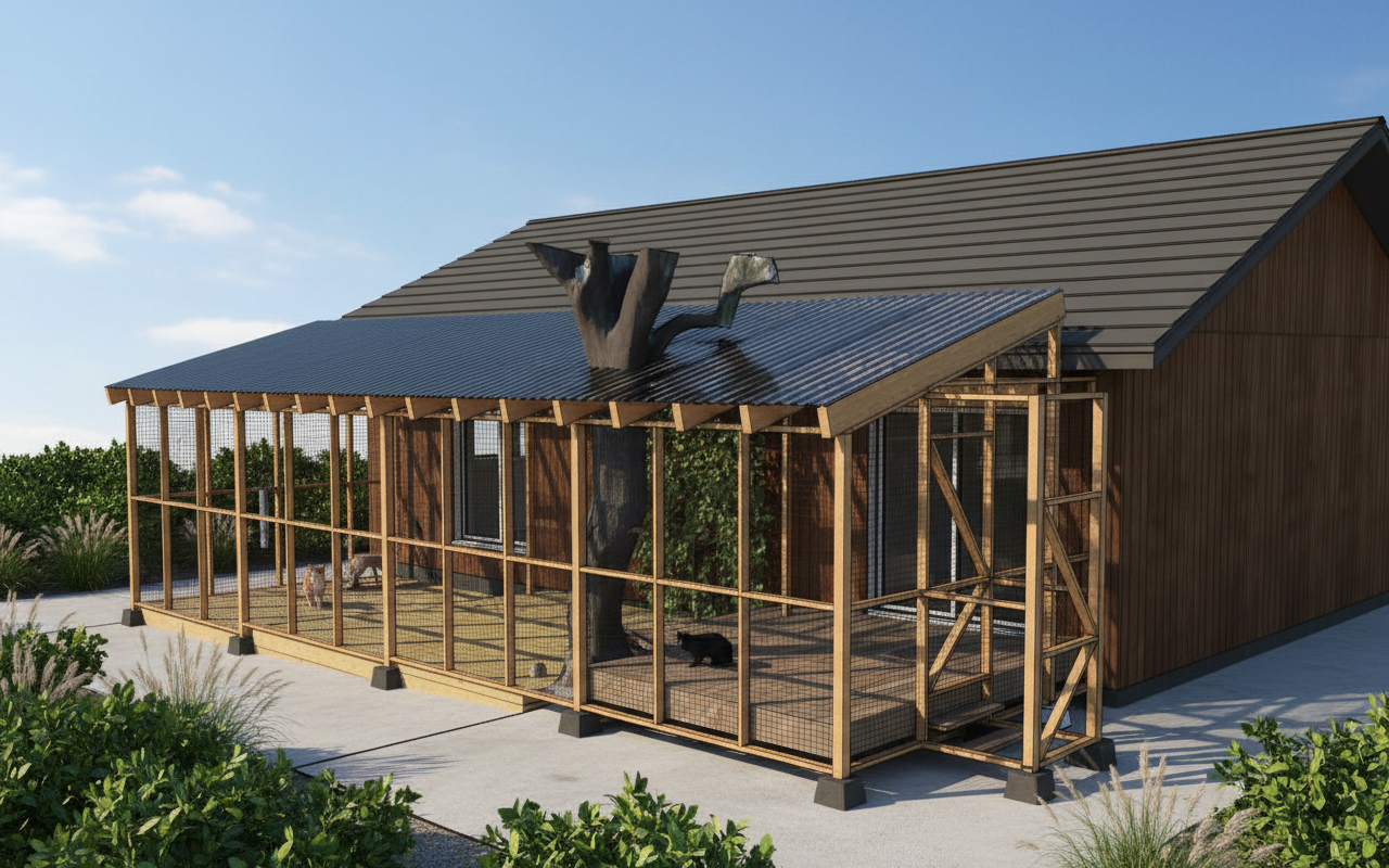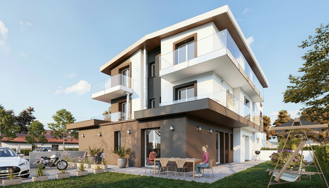 transform this image into a high end architectural landscape render enhance realism with detailed materials clean geometry and refined lighting add natural elements such as lush vegetation trees and subtle terrain modeling apply soft global illumination realistic shadows and atmospheric depth incorporate human scale elements like pathways seating and small figures for scale use a modern architectural visualization style with balanced composition warm natural light and a slightly cinematic tone improve sky with soft clouds and natural gradients ensure textures are sharp with realistic reflections and surface finishes