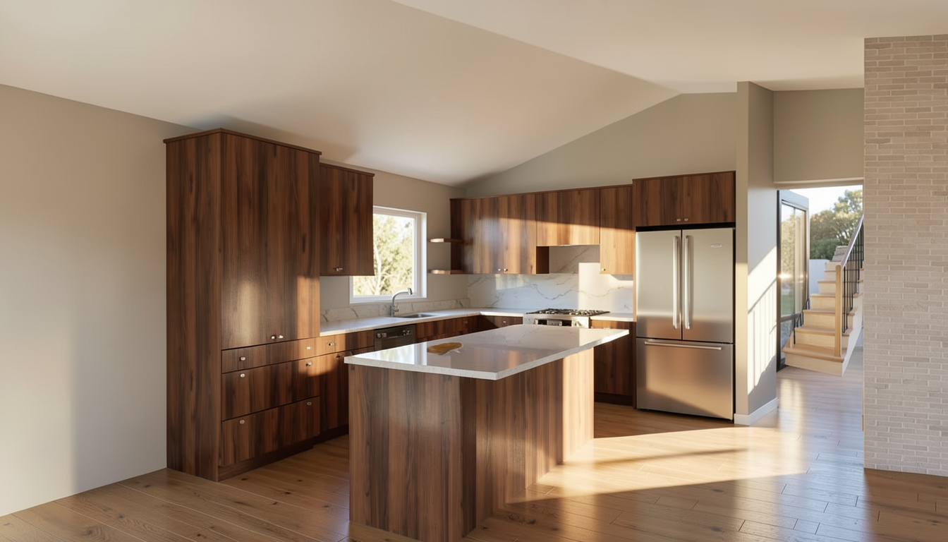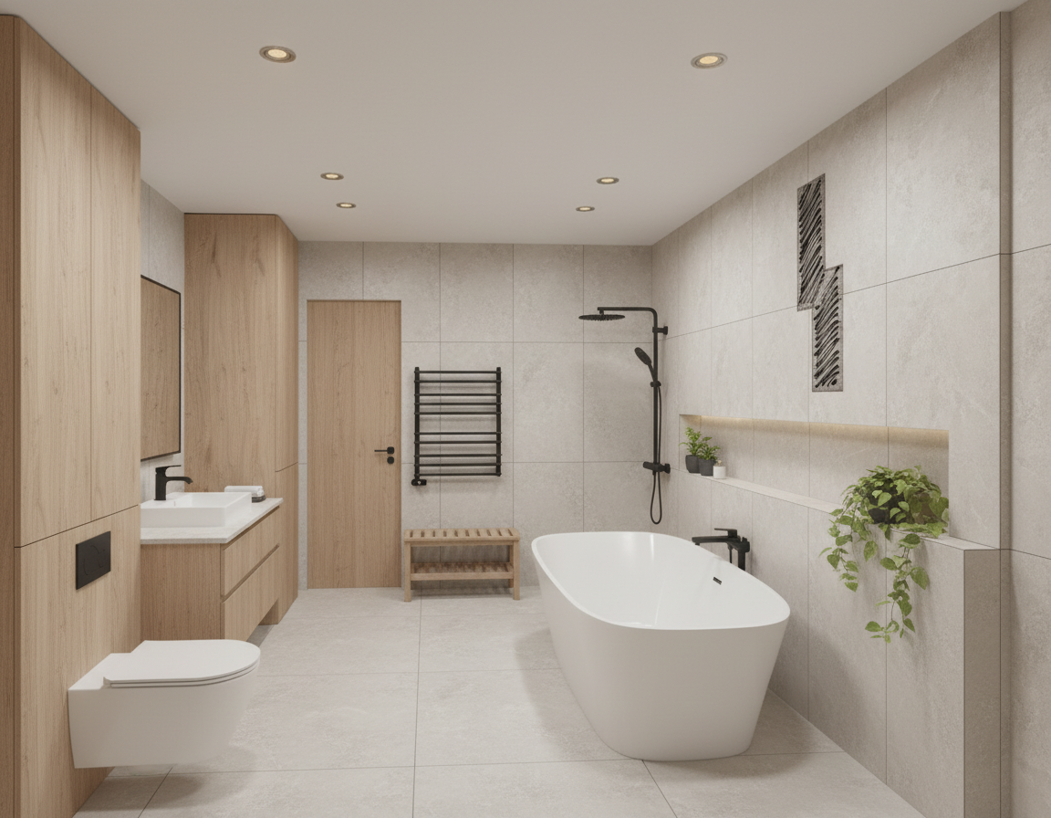 modify the ceiling using a hard architectural cut introduce a ceiling break cut plane at the wall line before the glass sliding door the wood slatted ceiling must terminate at this cut plane do not allow any slats to continue beyond this boundary left side of the cut flat white ceiling only keep existing track lighting right side of the cut wood slatted ceiling with recessed led perimeter maintain current layout and proportions critical language do not remove hard ceiling termination no continuation beyond cut plane distinct ceiling zones architectural separation at wall line lock elements do not change glass sliding door must remain glass wall finishes lighting positions gym equipment camera angle