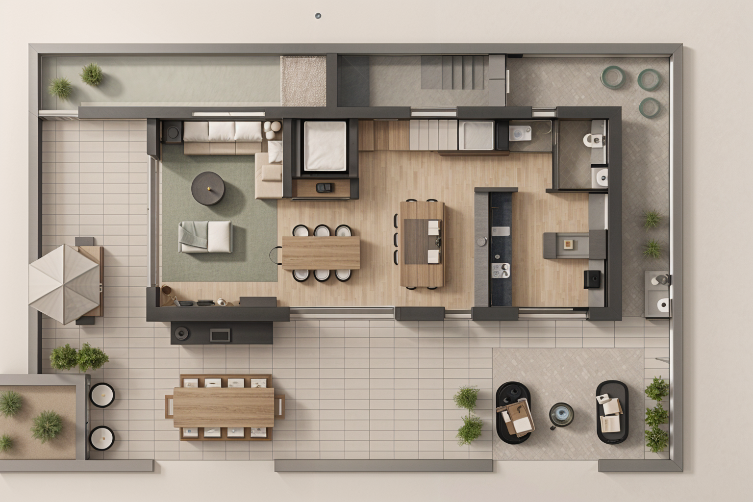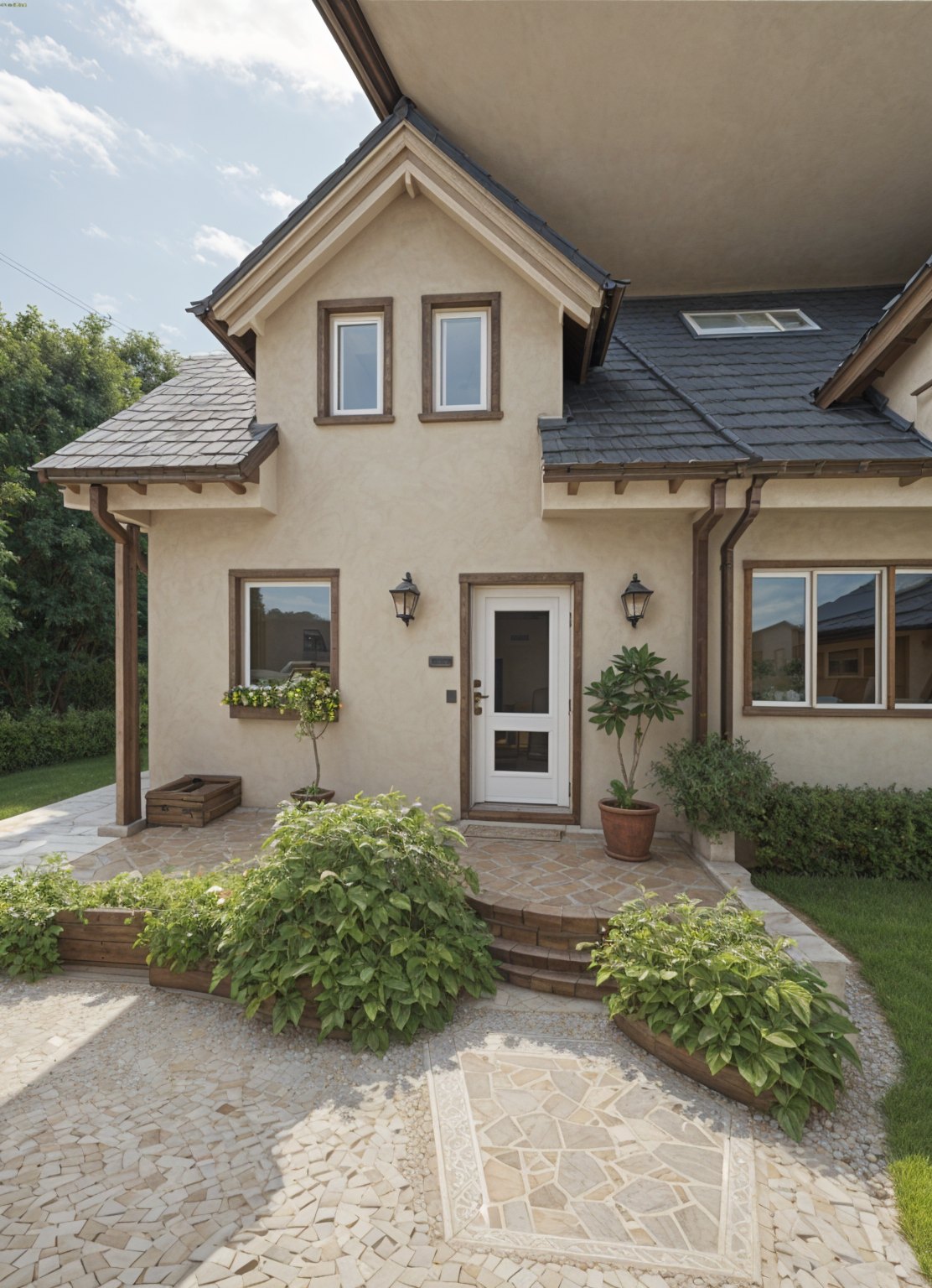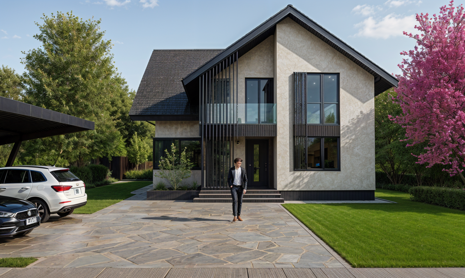 exterior sunny image of a modern house with plaster facade and antracite insertions reflective glass of the windows